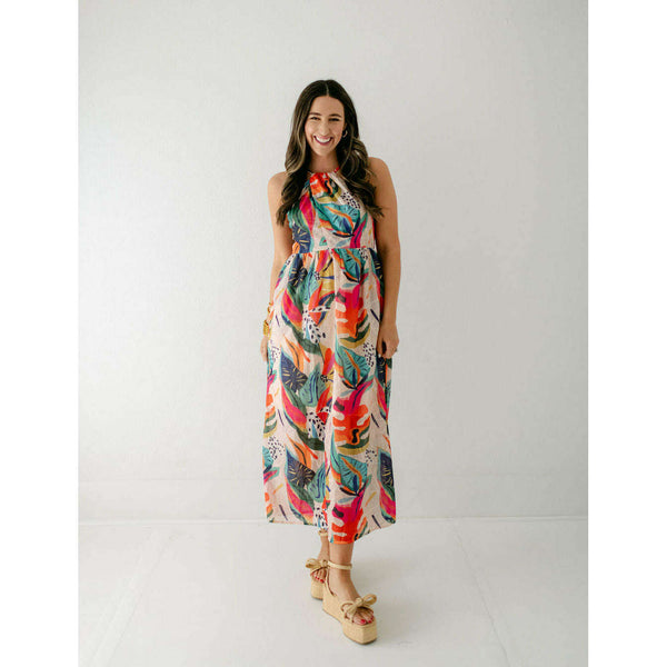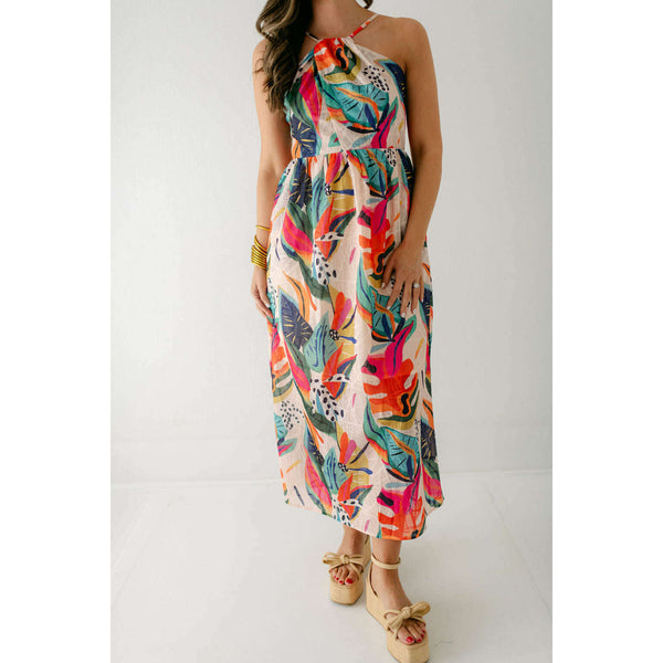 Turn heads this season in our playful Jade Melody Tam Tropical Foliage Front Cross Halter Maxi dress! The vibrant print and halter detailing make it a must-have for any sunny occasion. Get ready to have some fun in the sun...