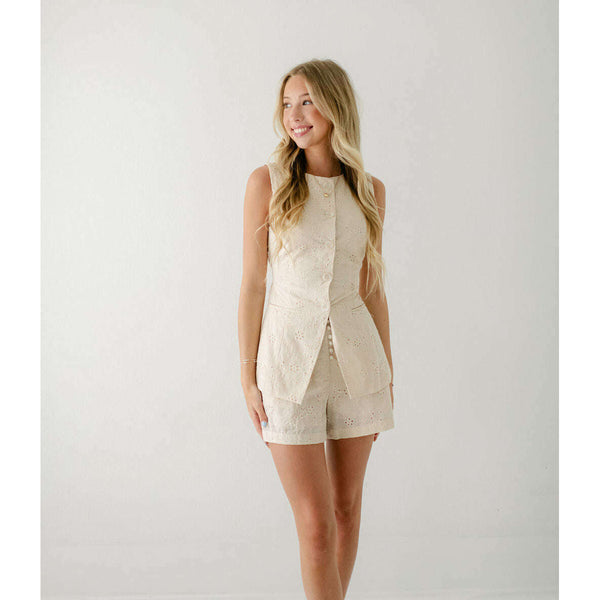 Get ready to turn heads with the Karlie Eyelet Button Shorts in Beige! These shorts are not only cute and stylish, but they also feature unique eyelet detailing. Pair them with our matching Karlie Eyelet Button Vest for a complete...