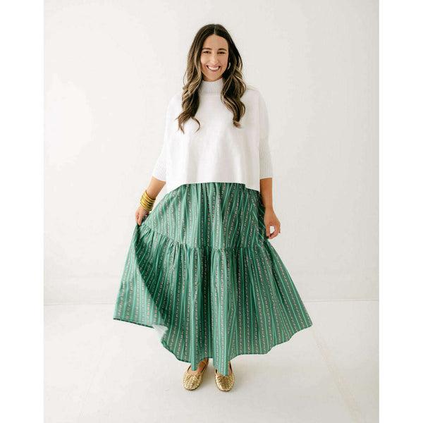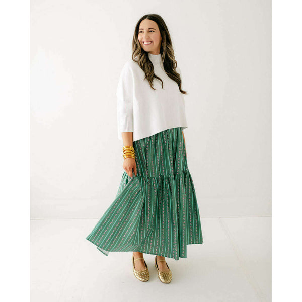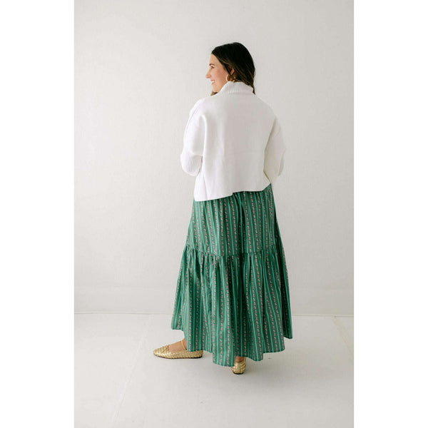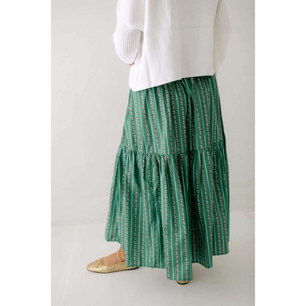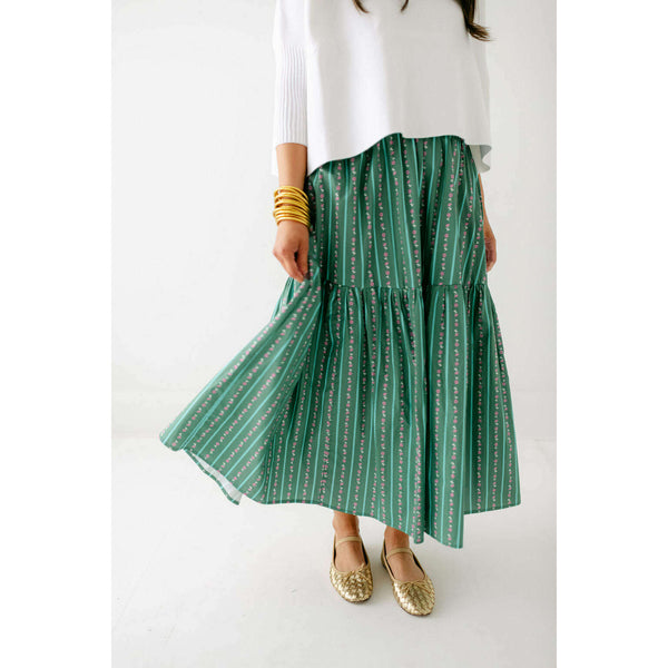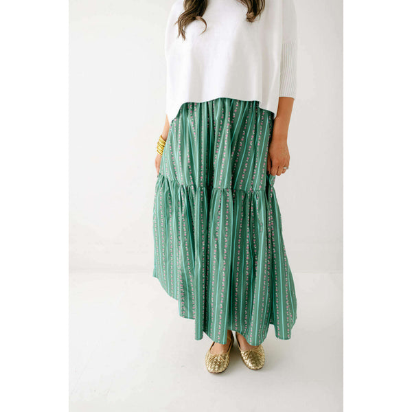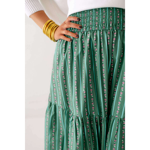 Embrace effortless fall style with this charming Karlie Floral Stripe Tiered Smocked Maxi Skirt. The delightful floral and stripe print brings playful personality to your seasonal wardrobe, while the tiered silhouette and smocked waistband create a flattering, comfortable fit. Perfect...