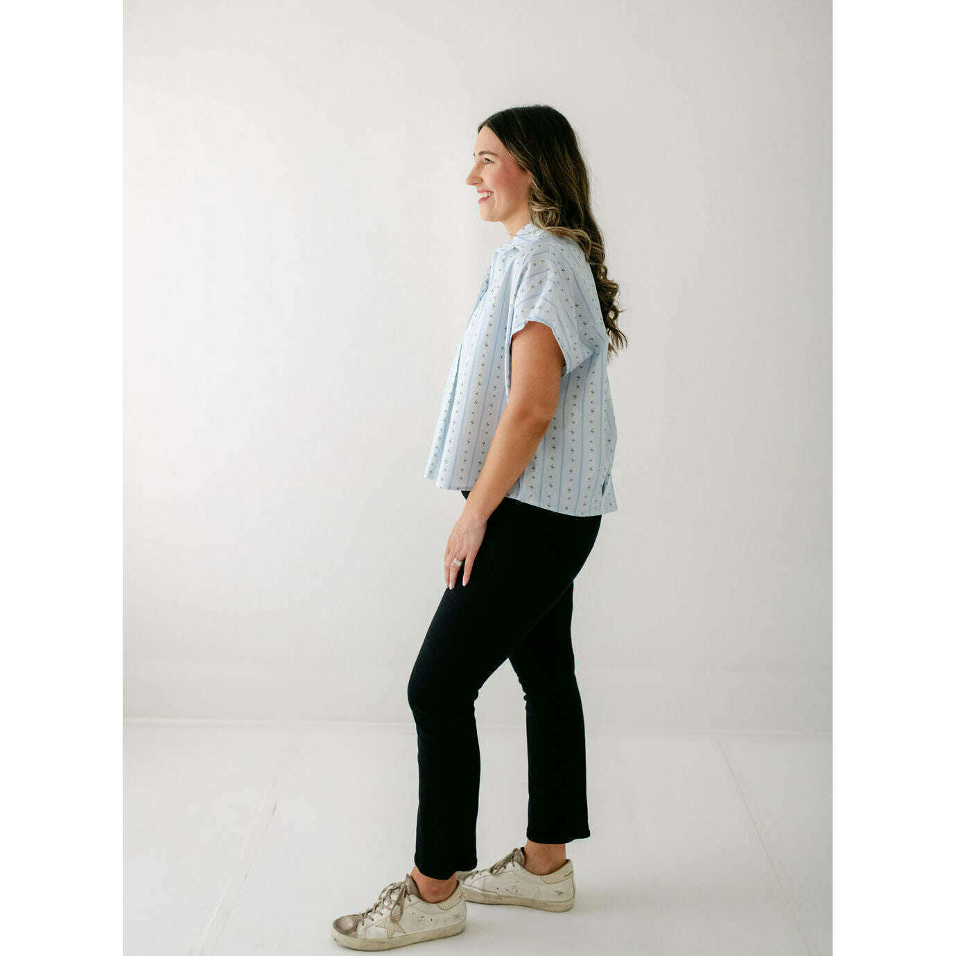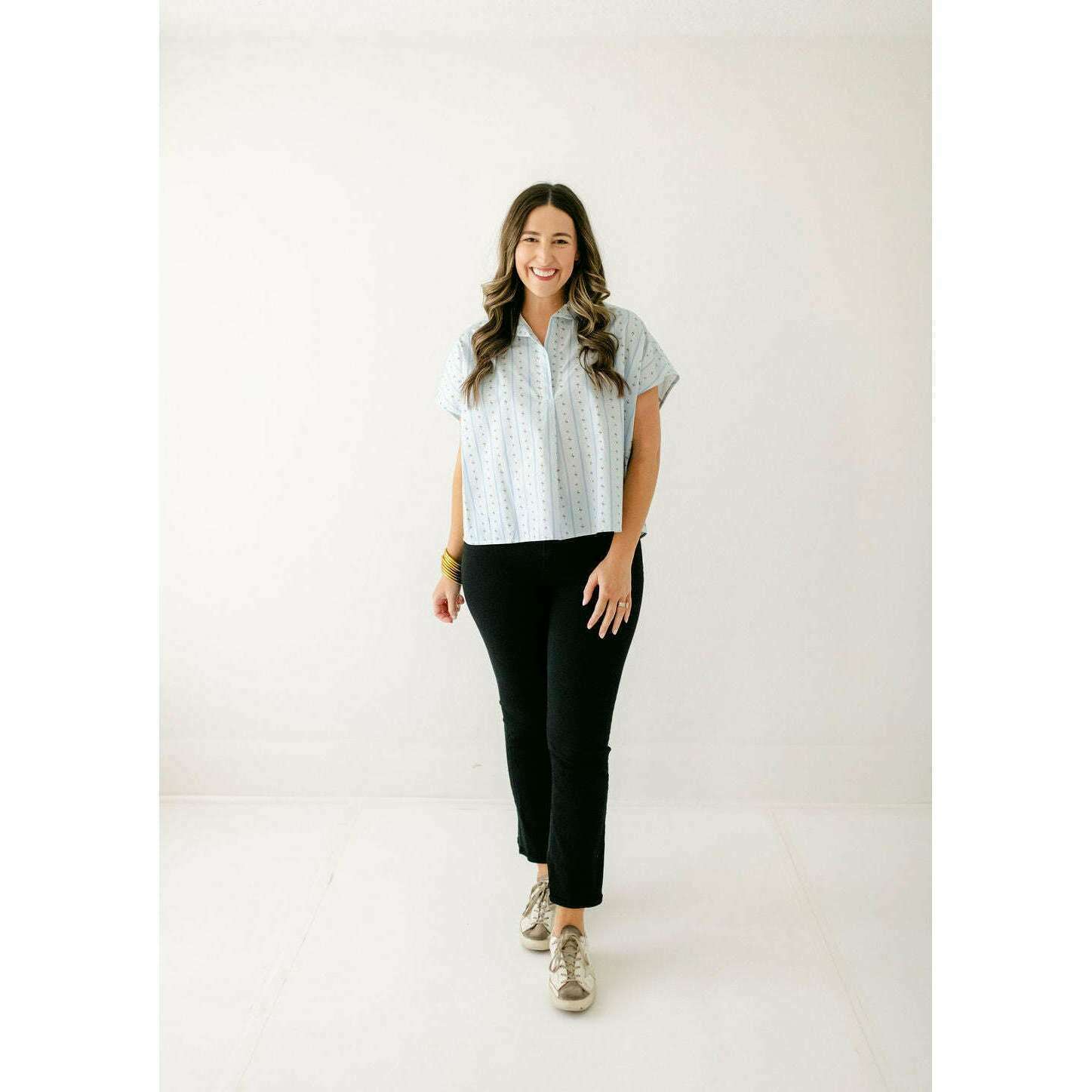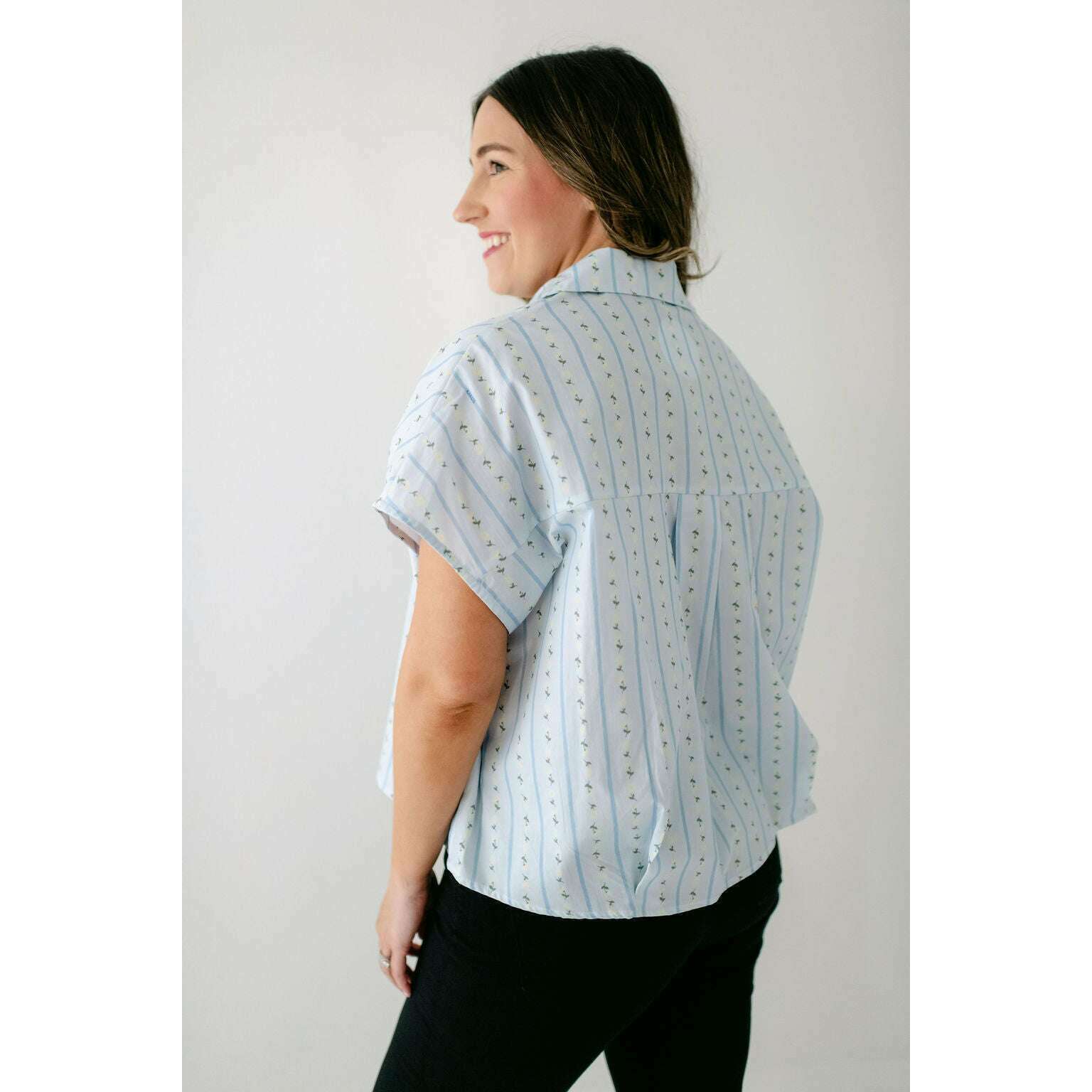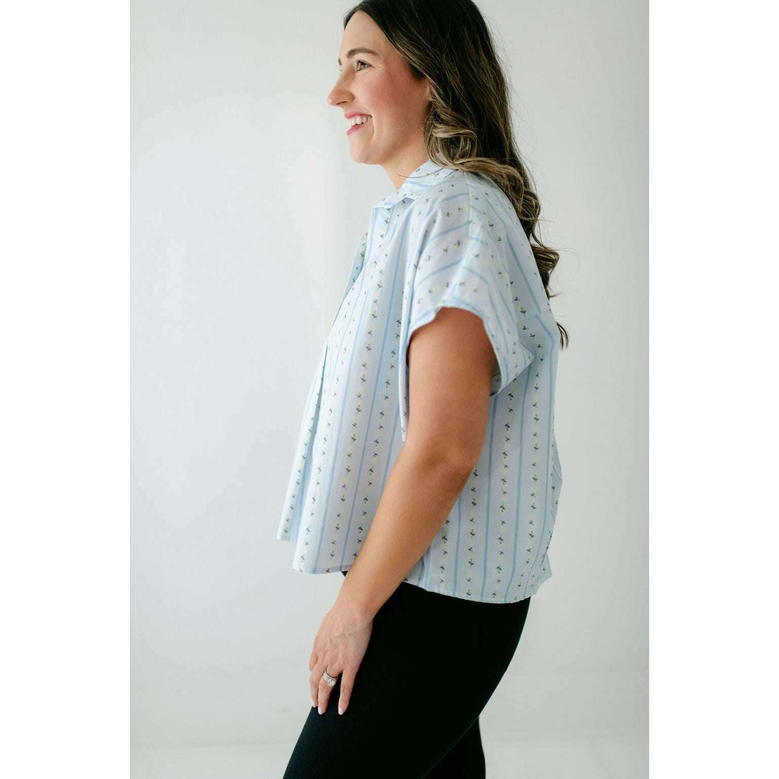 Elevate your wardrobe with the Karlie Floral Stripe Vneck Collar Top, blending delicate floral patterns with classic stripes for a fresh, stylish look. Its flattering V-neck and crisp collar add a touch of sophistication, making it perfect for both casual outings and office wear. Crafted for comfort and style, this top effortlessly enhances your everyday ensemble with a unique, feminine charm.