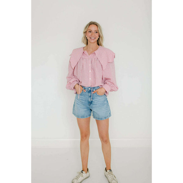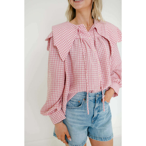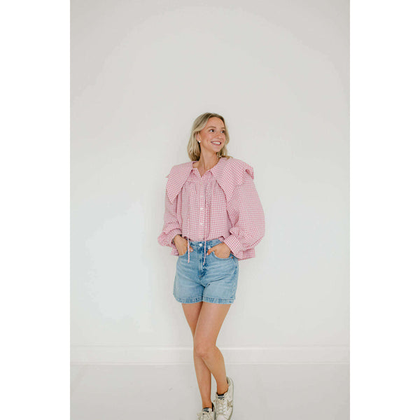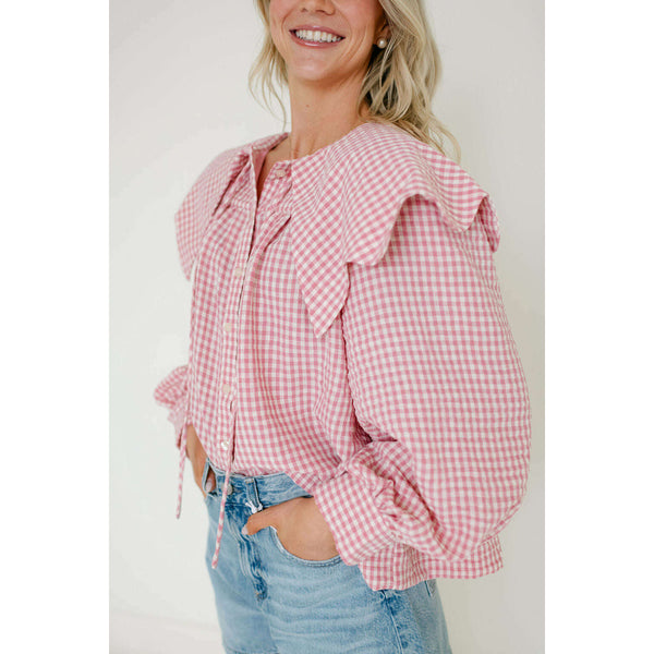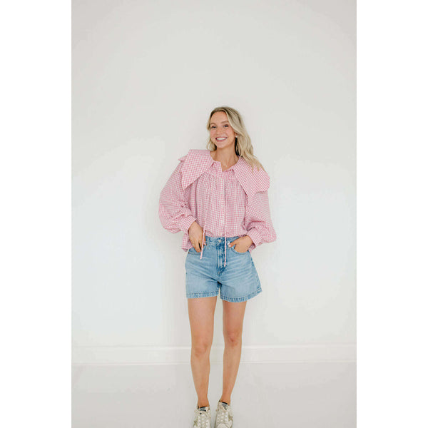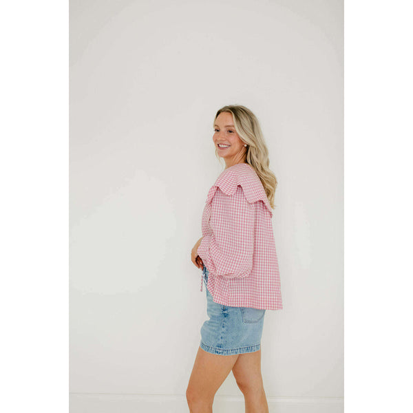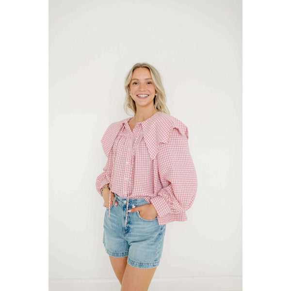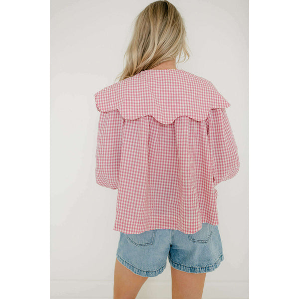The Karlie Pink Gingham Peter Pan Collar Top is a charming piece that brings playful elegance to your everyday wardrobe. With its sweet gingham pattern and signature Peter Pan collar, this top is designed to become a go-to favorite you'll...