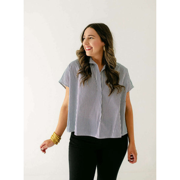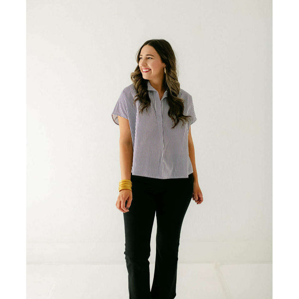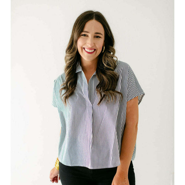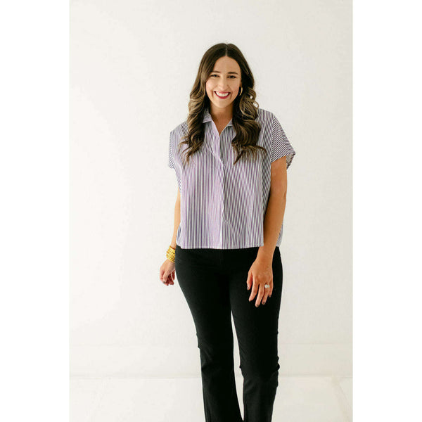 The Karlie Stripe Signature V-Neck Collar Top in Navy is a stylish essential for fall. Its flattering V-neck and classic collar add a polished touch, while the navy stripes provide a versatile look. Pair it effortlessly with your favorite jeans...