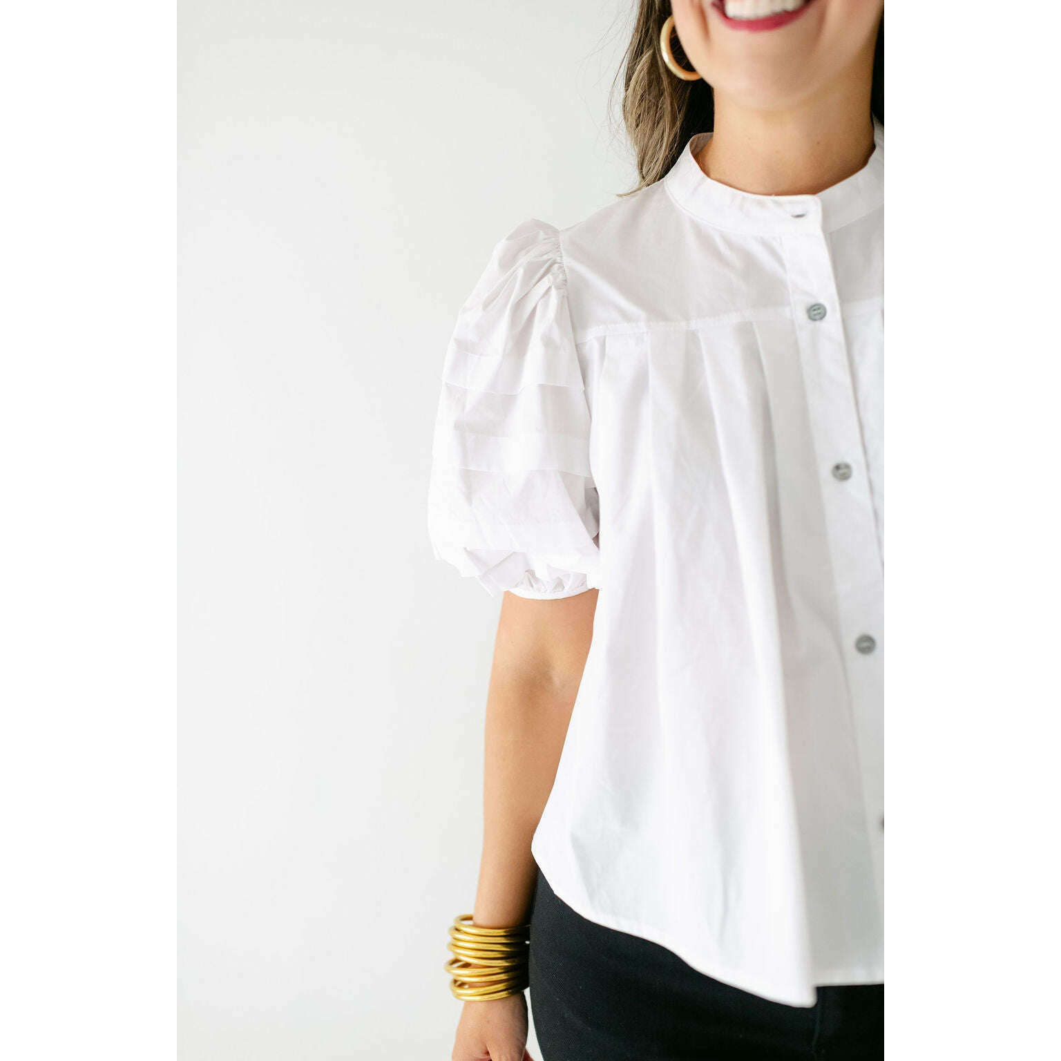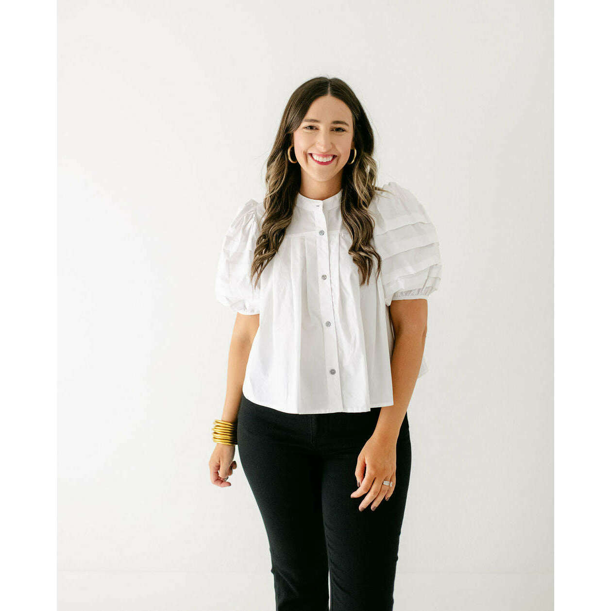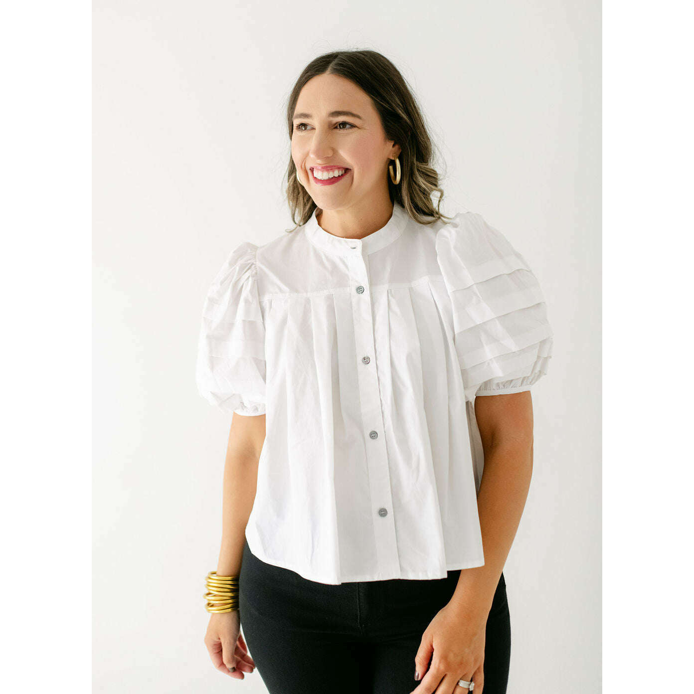 The Karlie White Poplin Pleated Sleeve Top is a charming essential for your fall wardrobe. Its crisp white poplin fabric and delicate pleated sleeves bring a fresh, playful touch to any outfit while maintaining a classic look. Perfect for layering or wearing on its own, this top combines style and versatility to keep you looking effortlessly chic throughout the season.