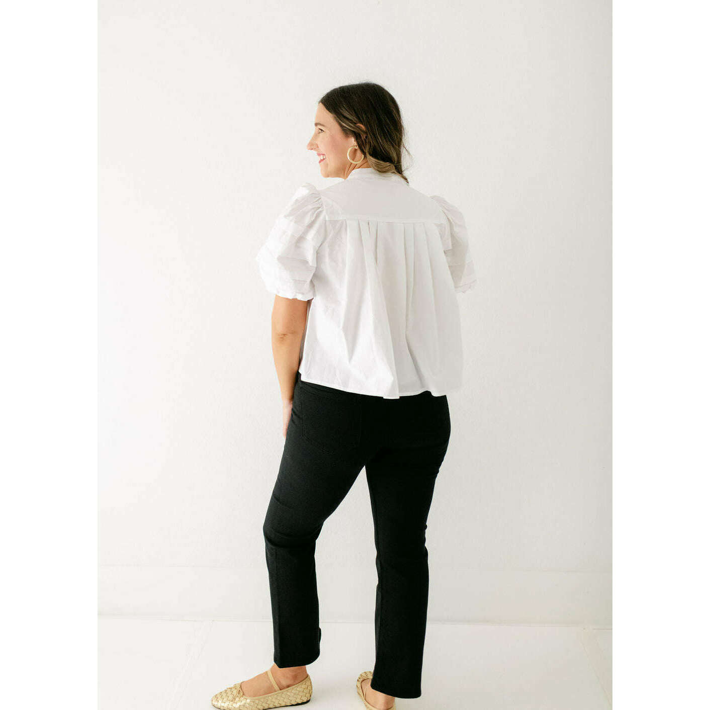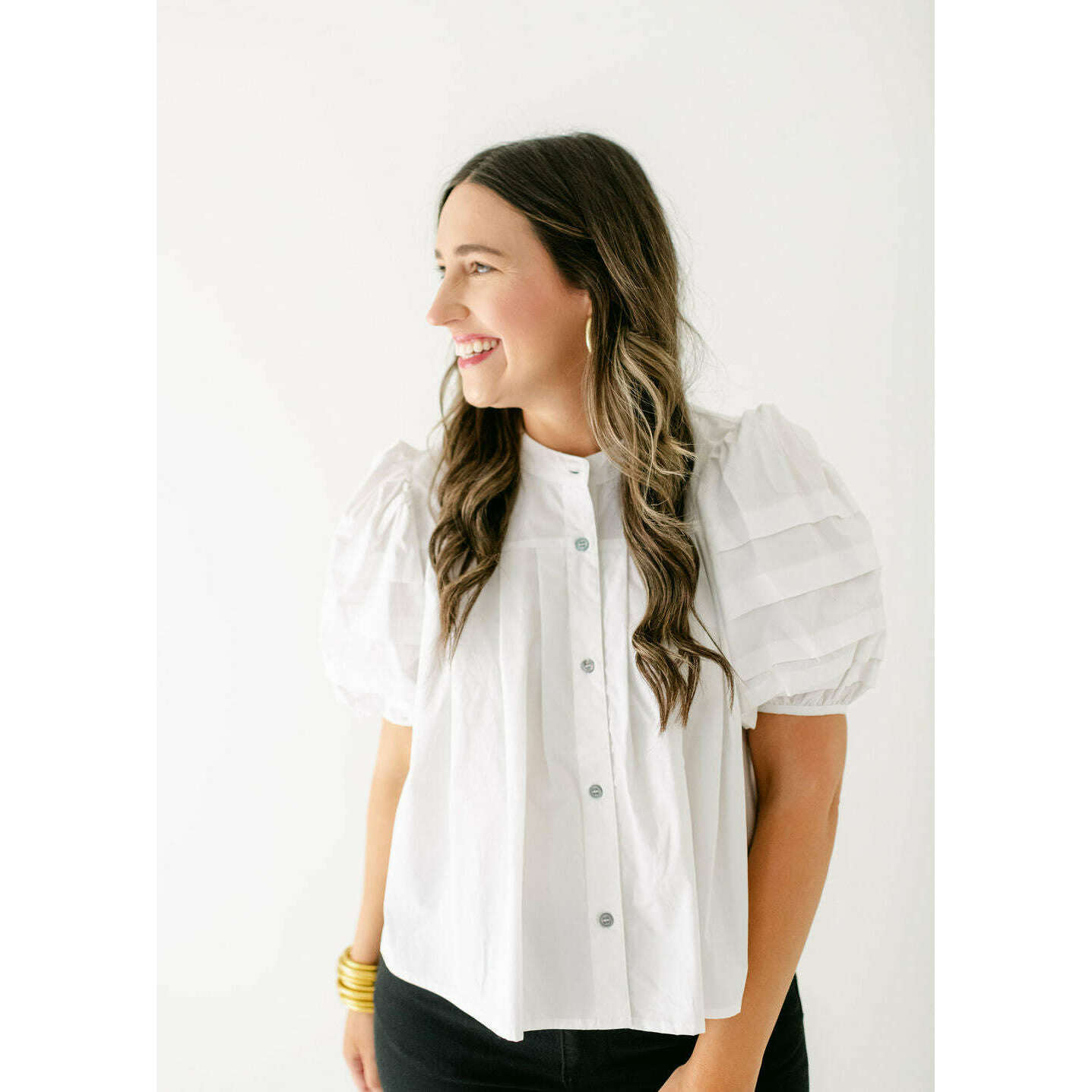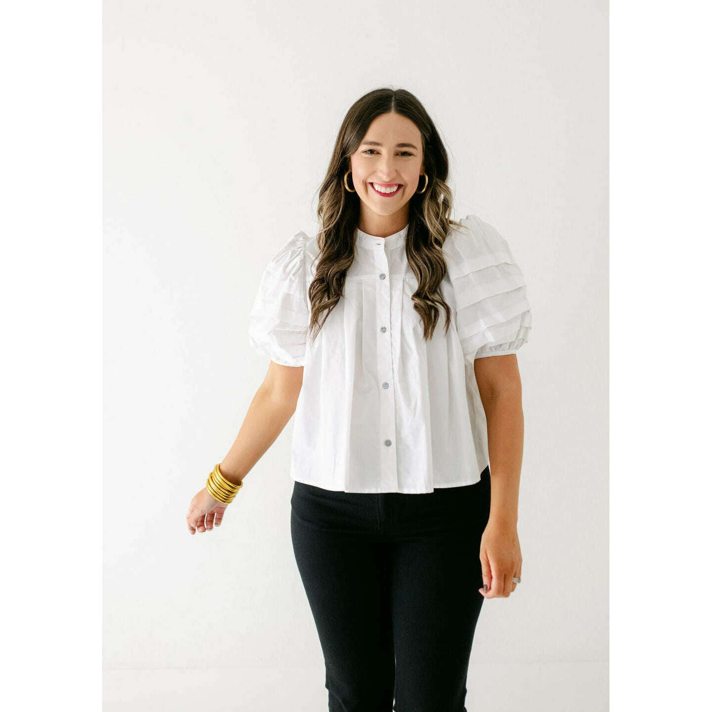 The Karlie White Poplin Pleated Sleeve Top is a charming essential for your fall wardrobe. Its crisp white poplin fabric and delicate pleated sleeves bring a fresh, playful touch to any outfit while maintaining a classic look. Perfect for layering or wearing on its own, this top combines style and versatility to keep you looking effortlessly chic throughout the season.