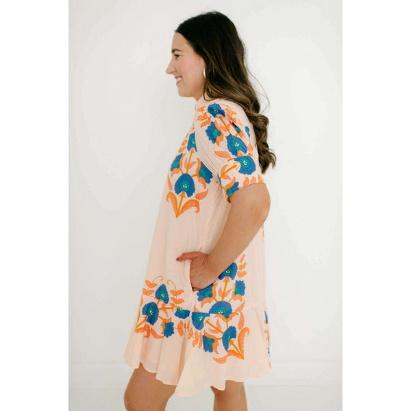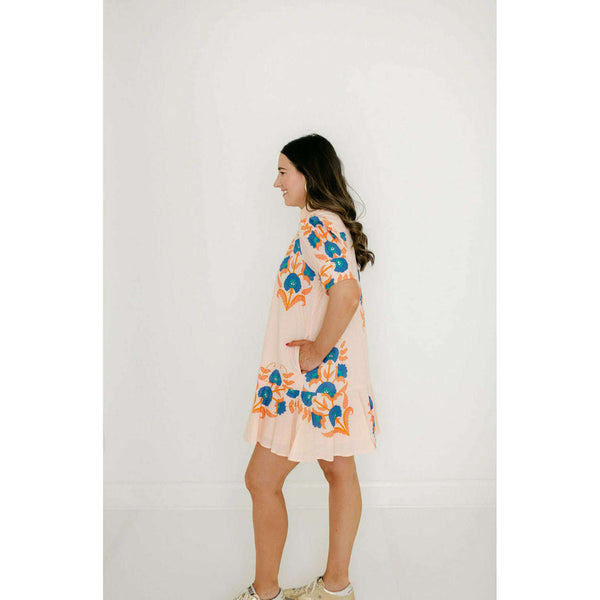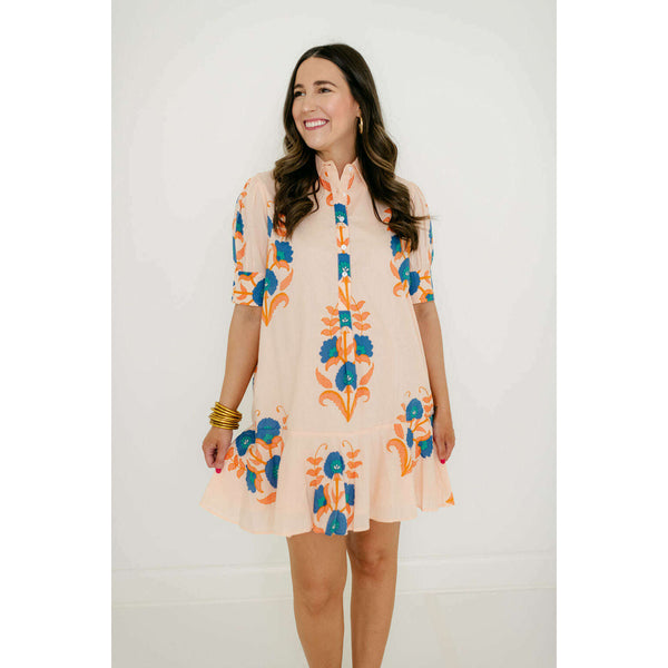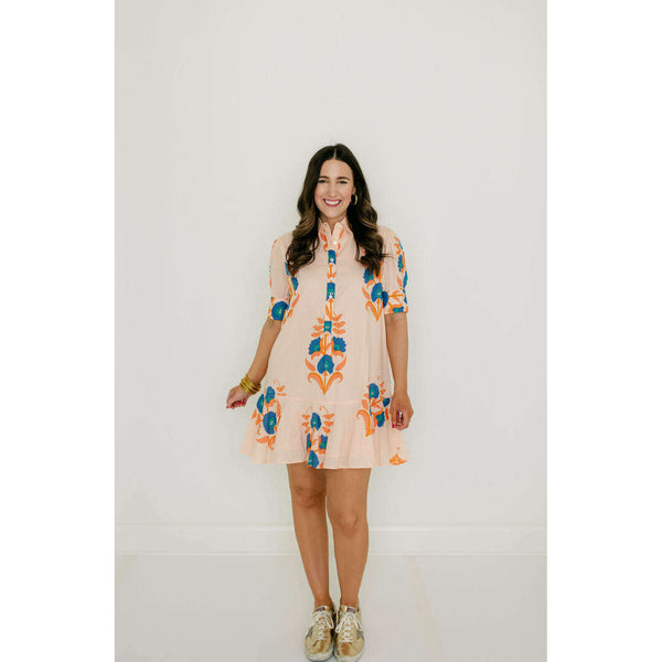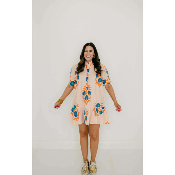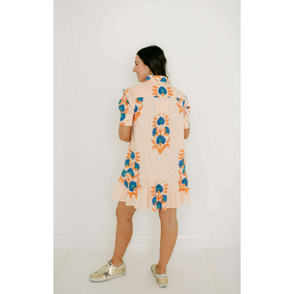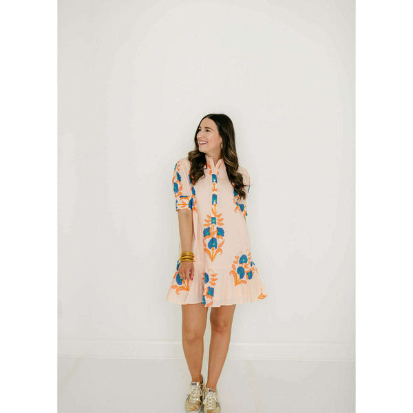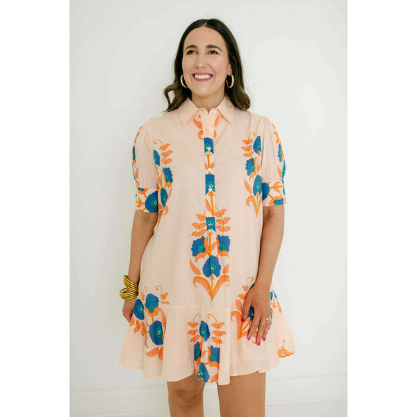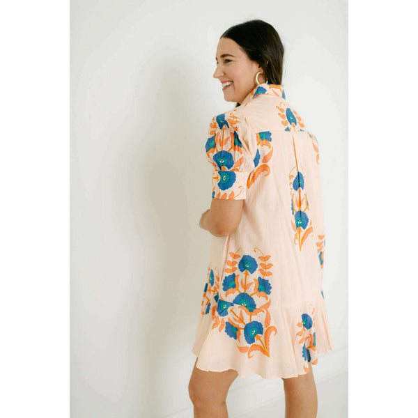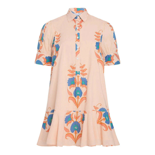The Liv Dress is a playful mini dress with a tailored bodice and a relaxed drop-waist silhouette. It features short puff sleeves with cuff detailing, a classic shirt collar, and a partial button placket down the front. The skirt is...