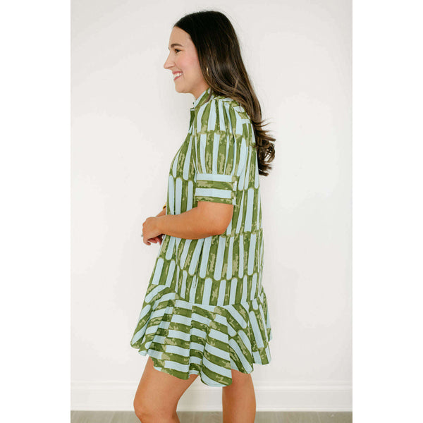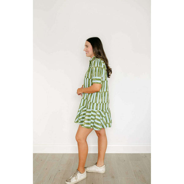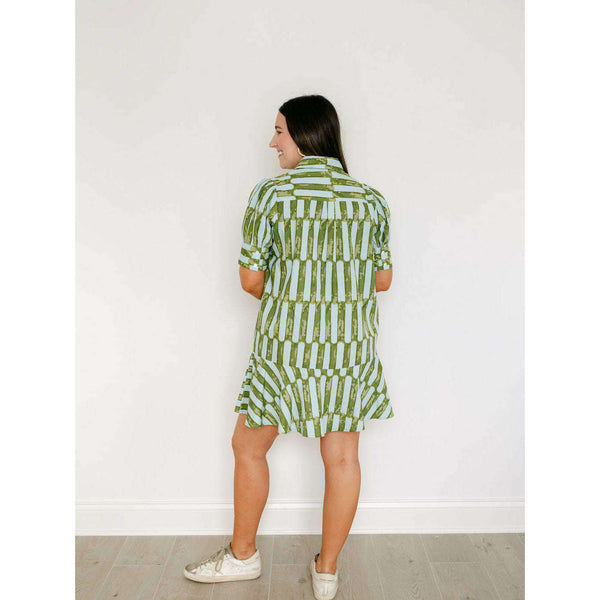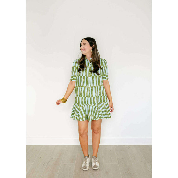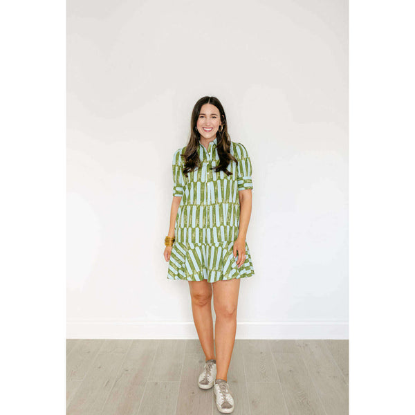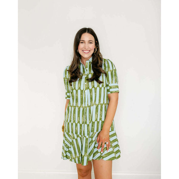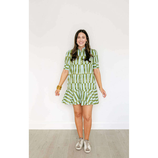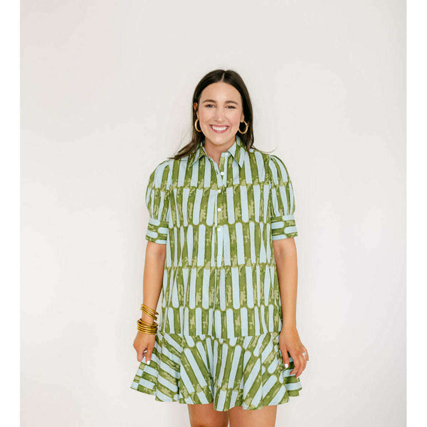 The Liv Dress is a playful mini dress with a tailored bodice and a relaxed drop-waist silhouette. It features short puff sleeves with cuff detailing, a classic shirt collar, and a partial button placket down the front. The skirt is...