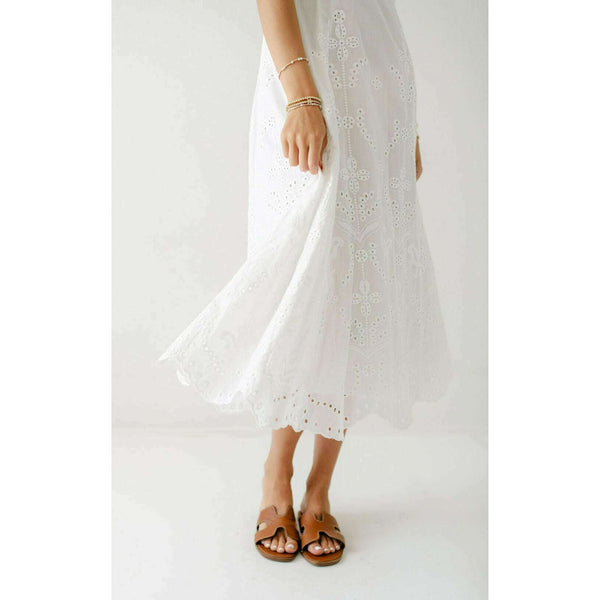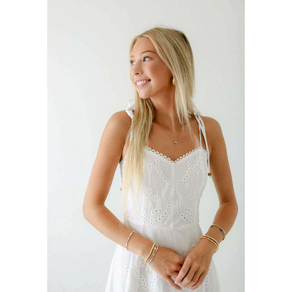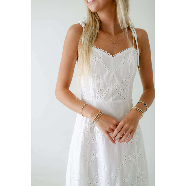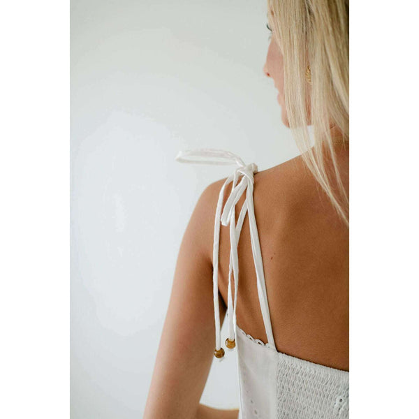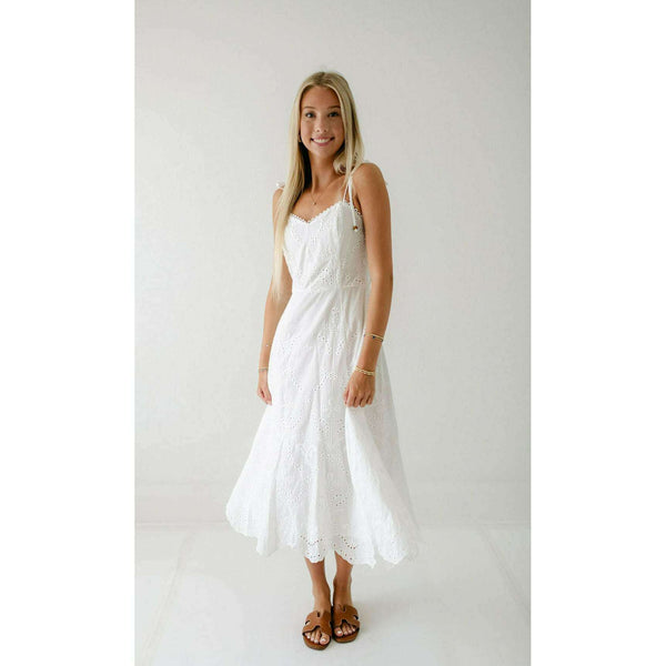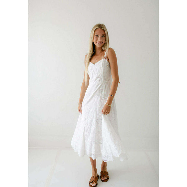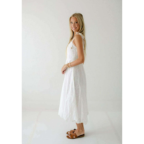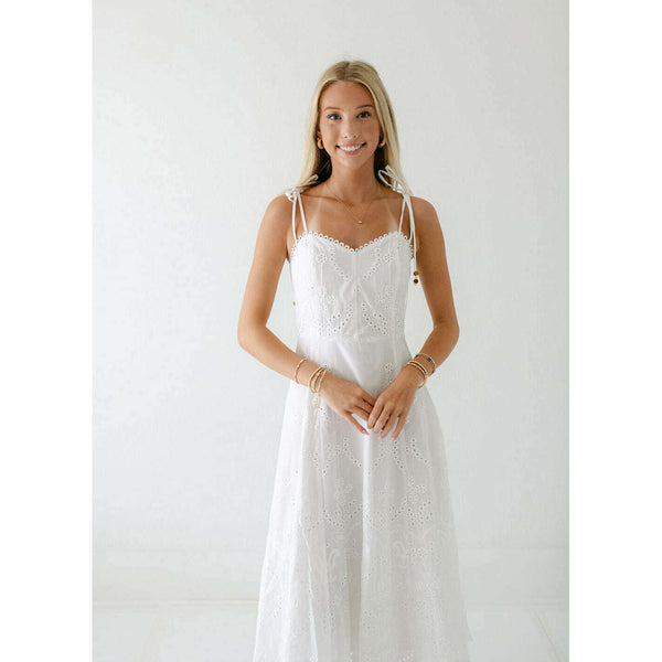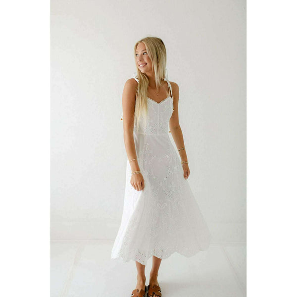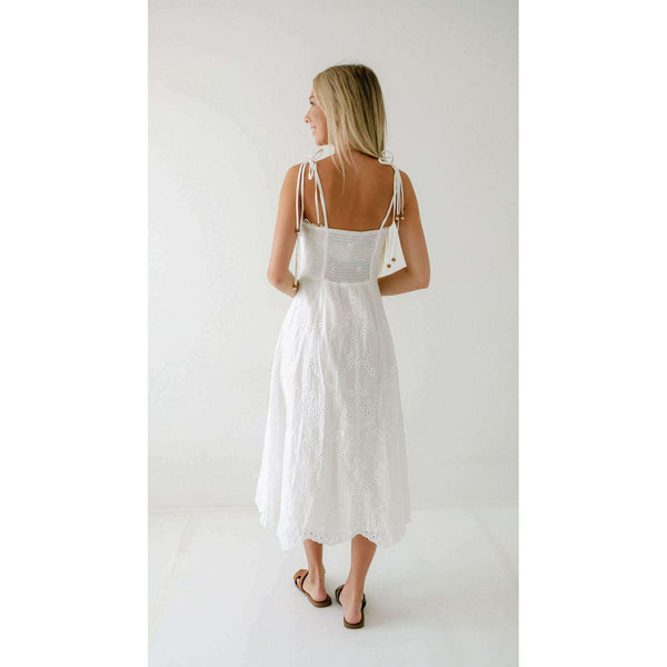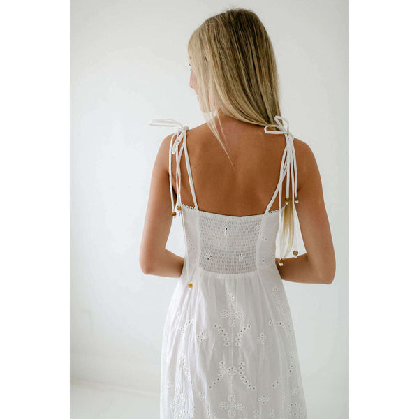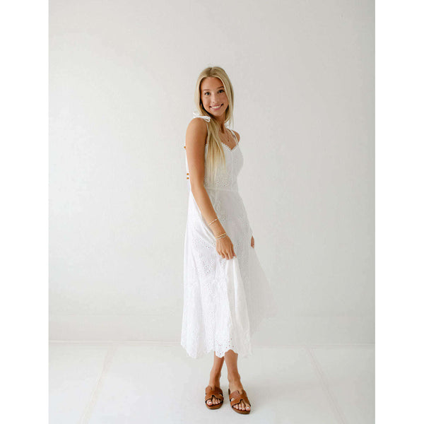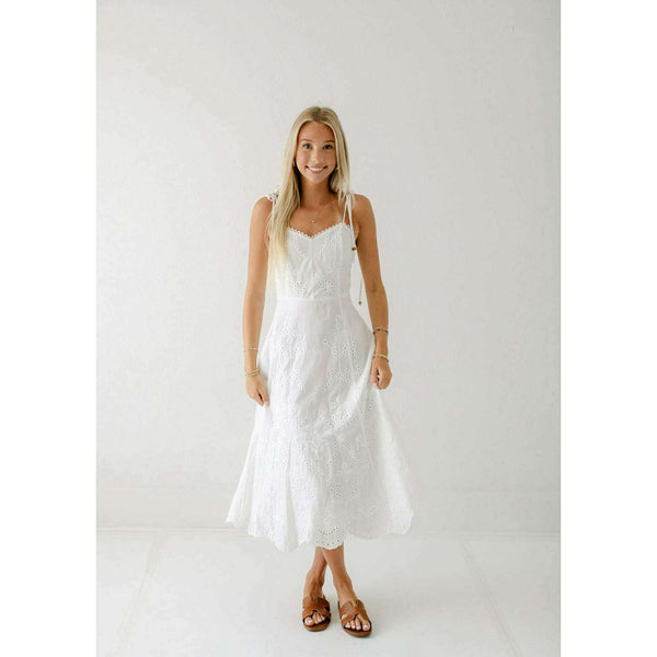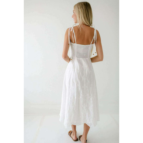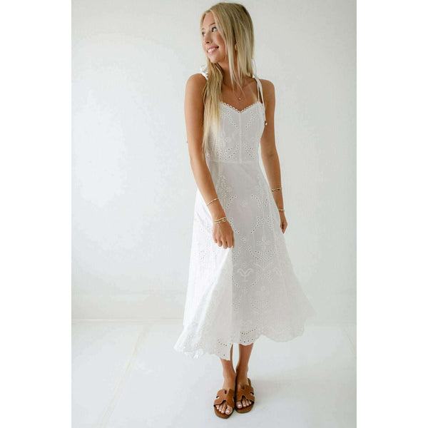 Elevate your summer wardrobe with this irresistibly charming Lucy Paris Maseline Eyelet Midi Dress! The delicate white eyelet fabric creates a breezy, feminine silhouette while the adorable tie detailing adds that perfect touch of playful sophistication. Perfect for brunches, garden...