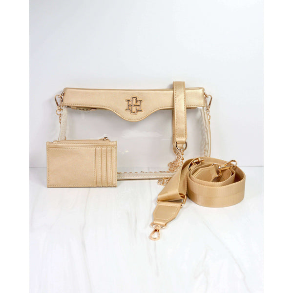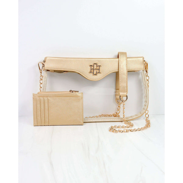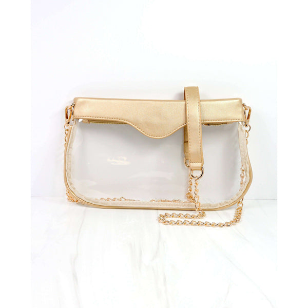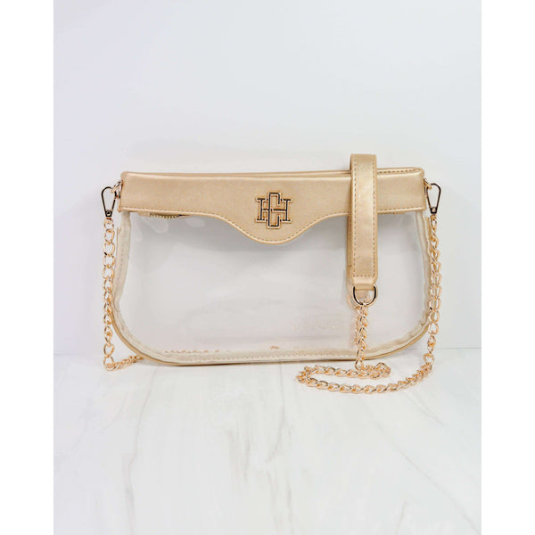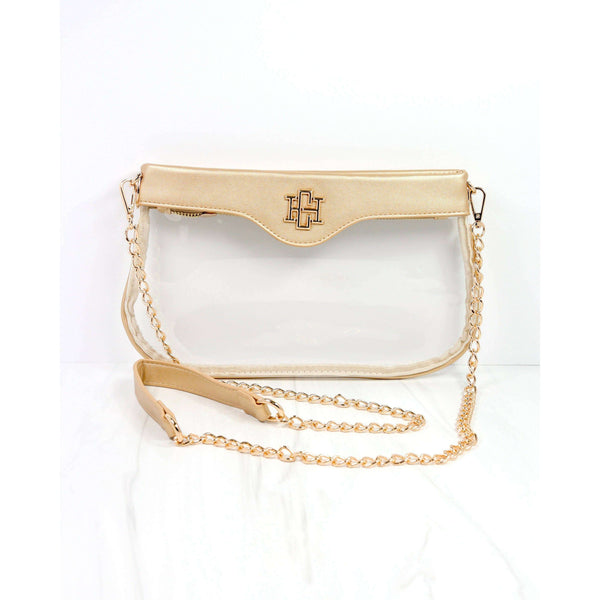 The Madi Clear Crossbody in Gold is the perfect accessory for game day, combining style and practicality. Its transparent design meets stadium requirements, while the chic chain strap adds a fashionable touch. Easily pair it with our purse chains, nylon...