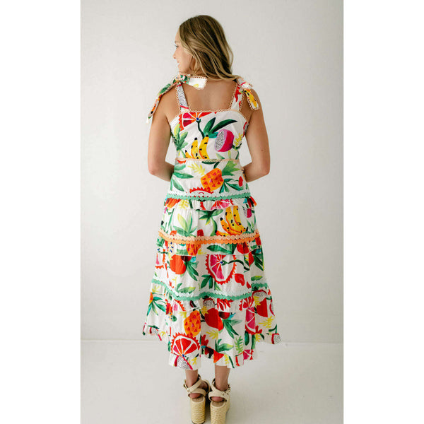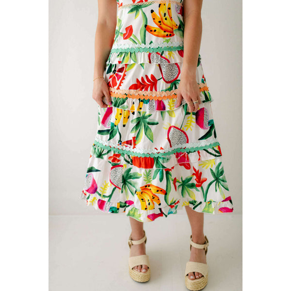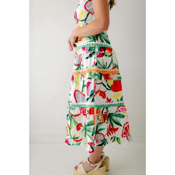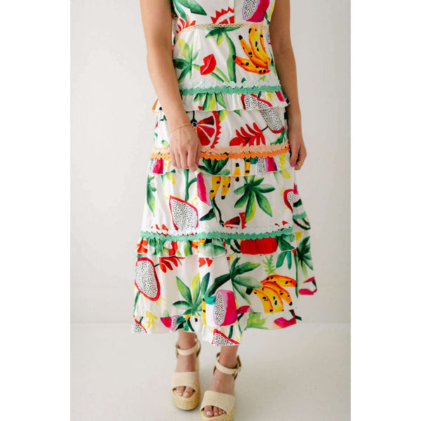 The Marie by Victoria Dunn Naomi Tropical Breeze Maxi Dress is the perfect addition to your summer wardrobe. With its playful print and charming ric rac detailing, this dress is sure to turn heads. Add a touch of fun to...