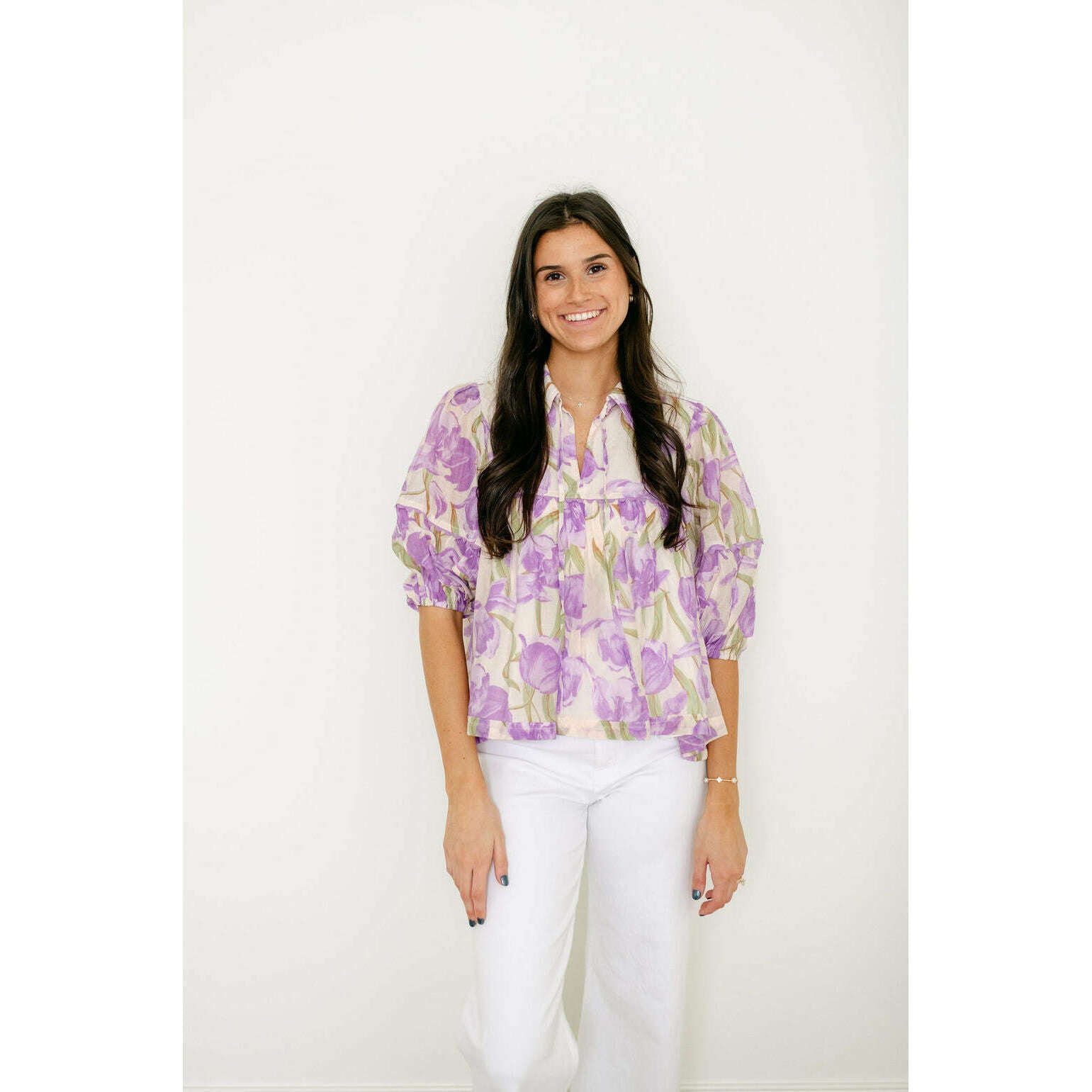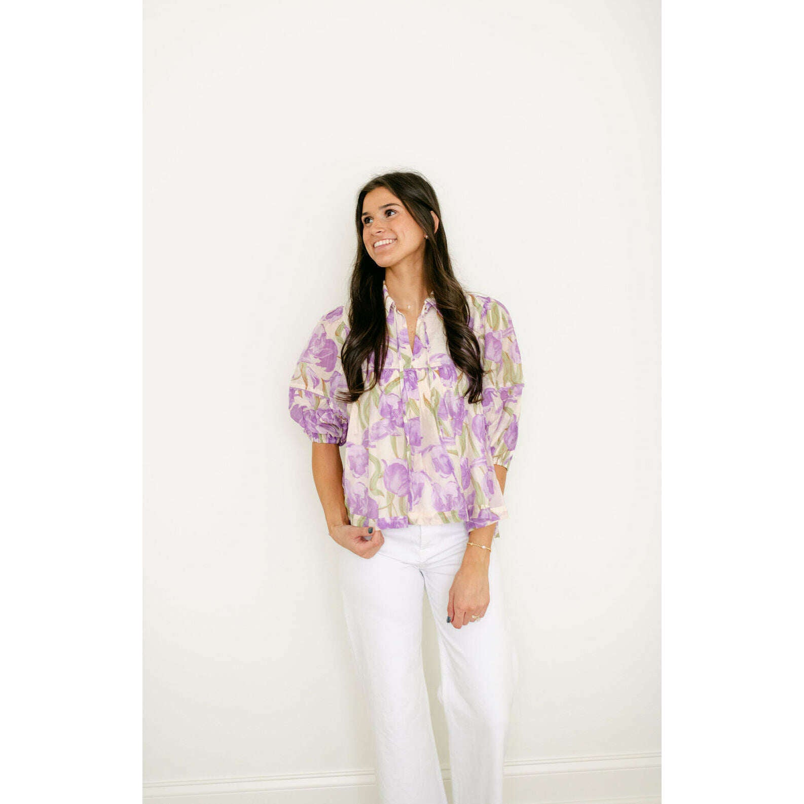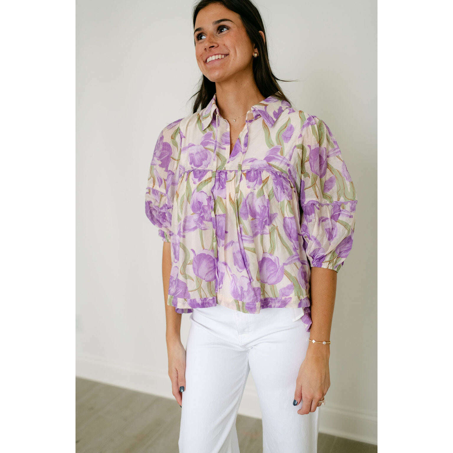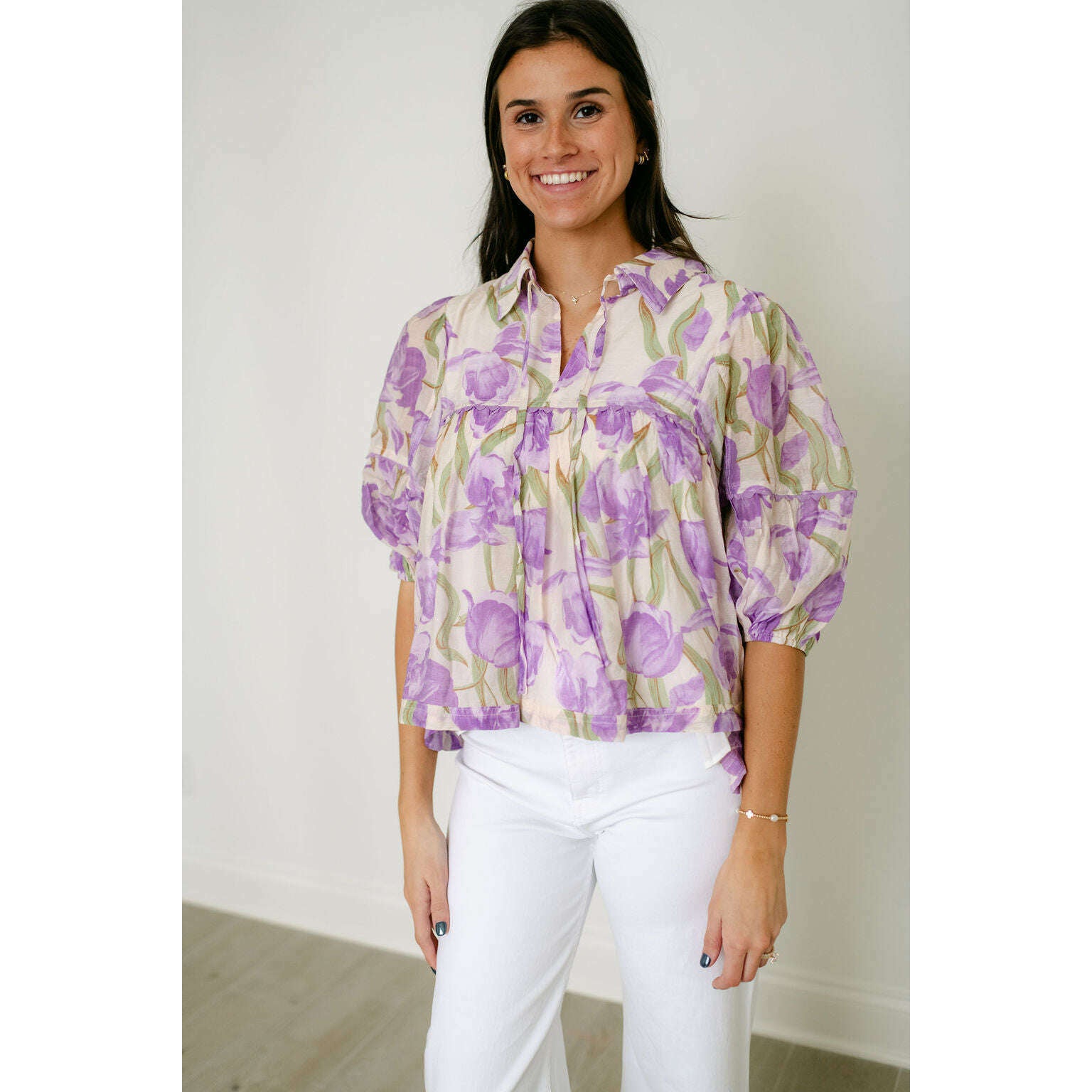 Wrap yourself in the painterly, romantic hues of Aphrodite's own garden. This stunning floral blouse captures the essence of a Grecian spring with its watercolor-inspired purple blooms. The effortless, tiered babydoll silhouette flows with every breezy step, while the collared tie-neck and romantic puff sleeves add a touch of timeless, feminine grace. It's the perfect top for a dreamy, sunlit day exploring the island.