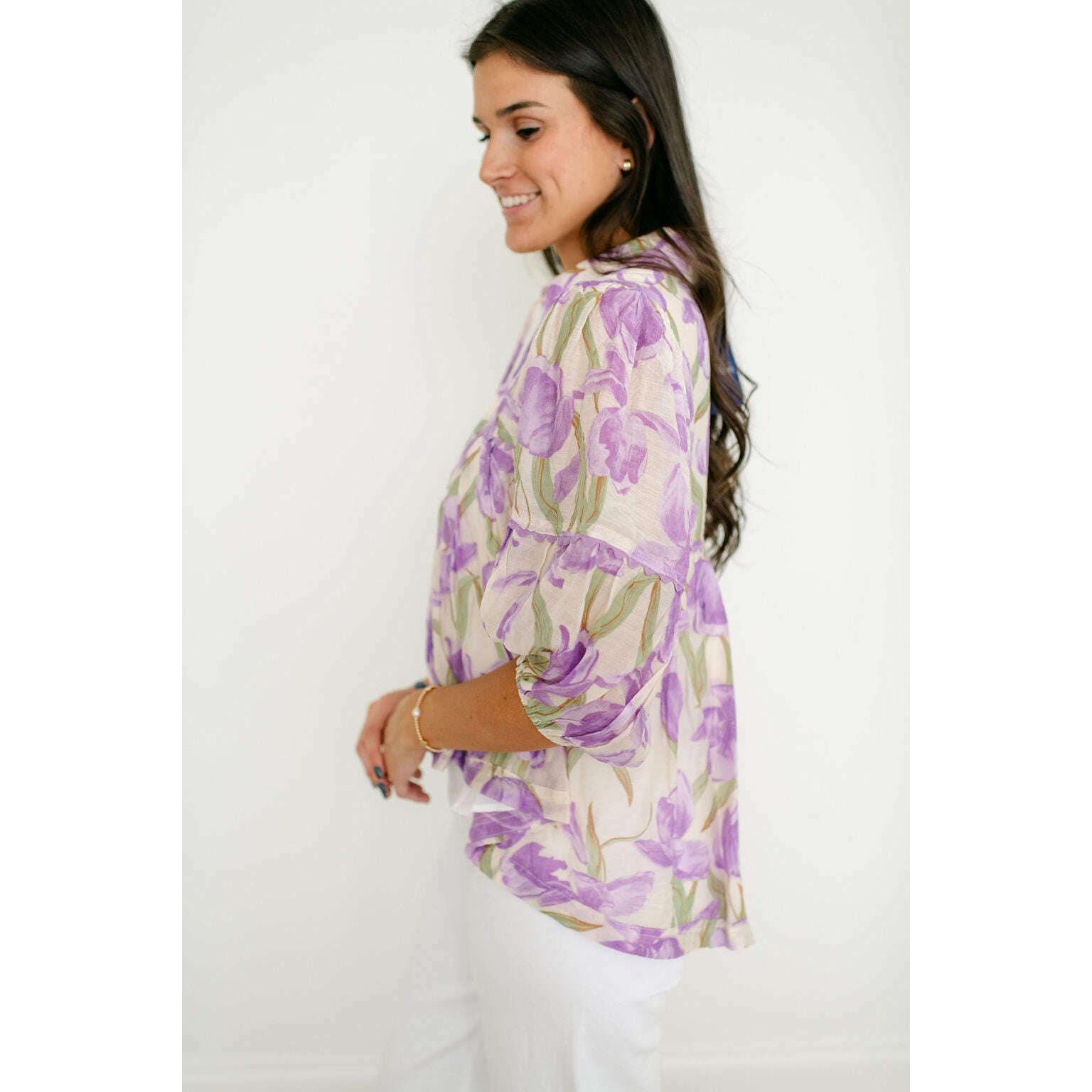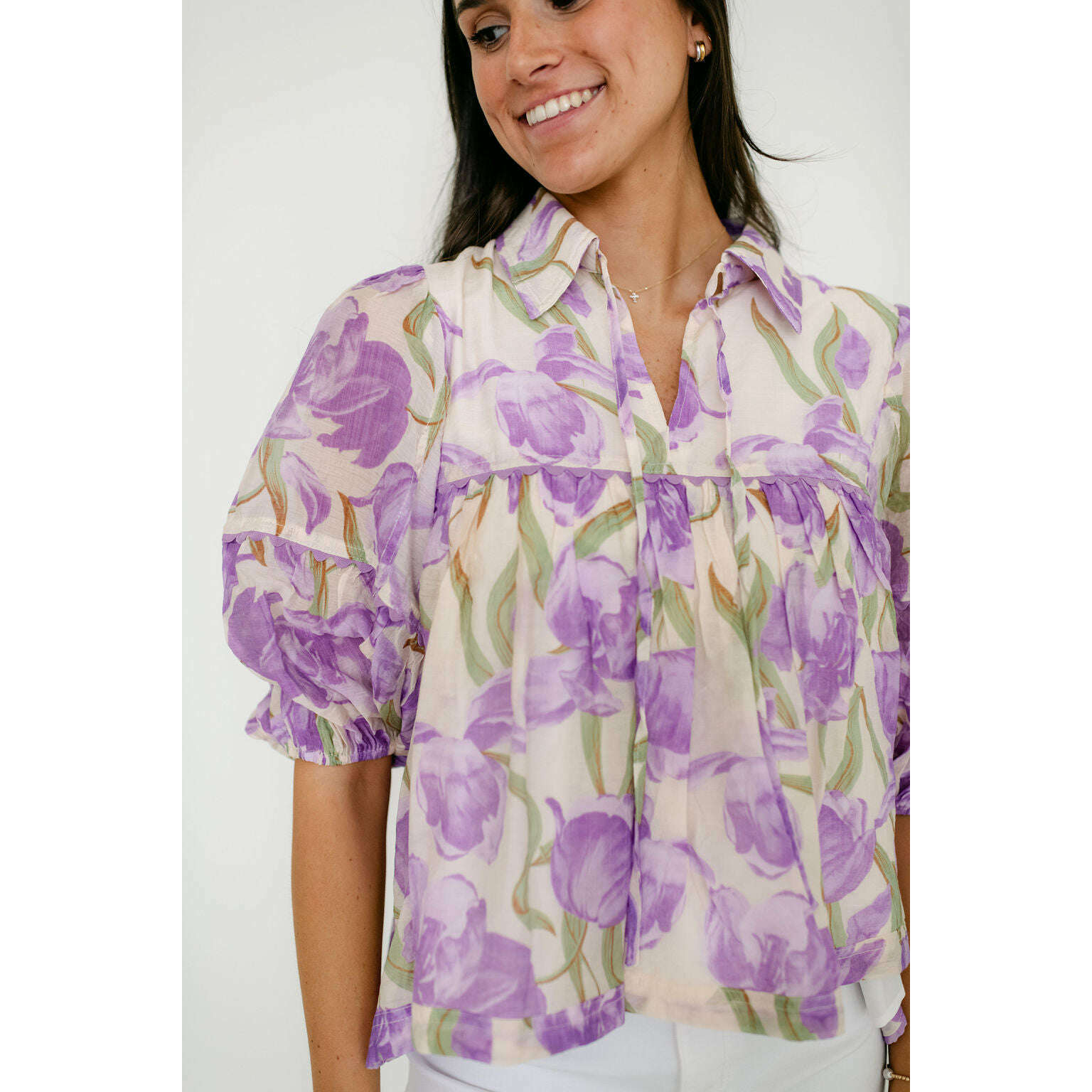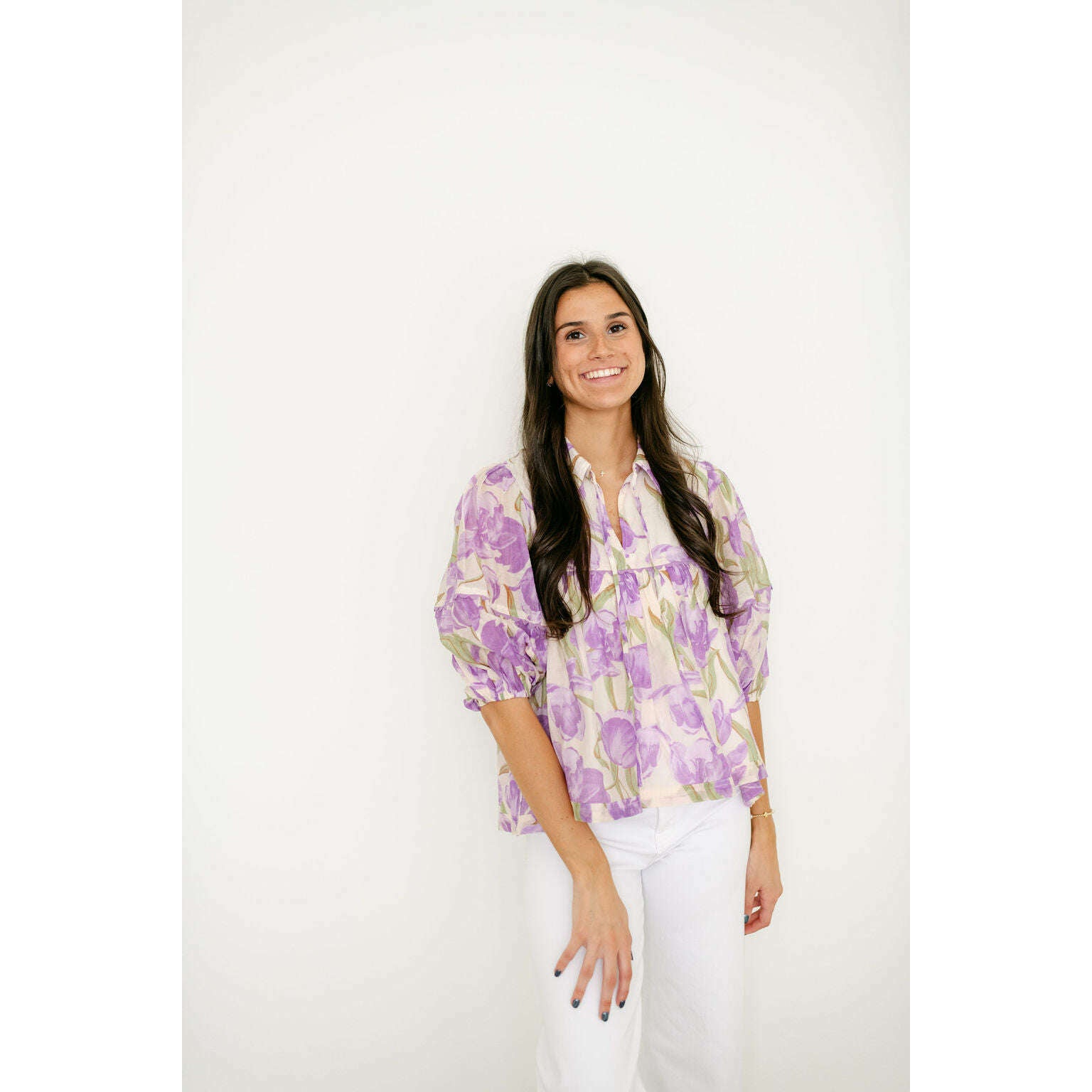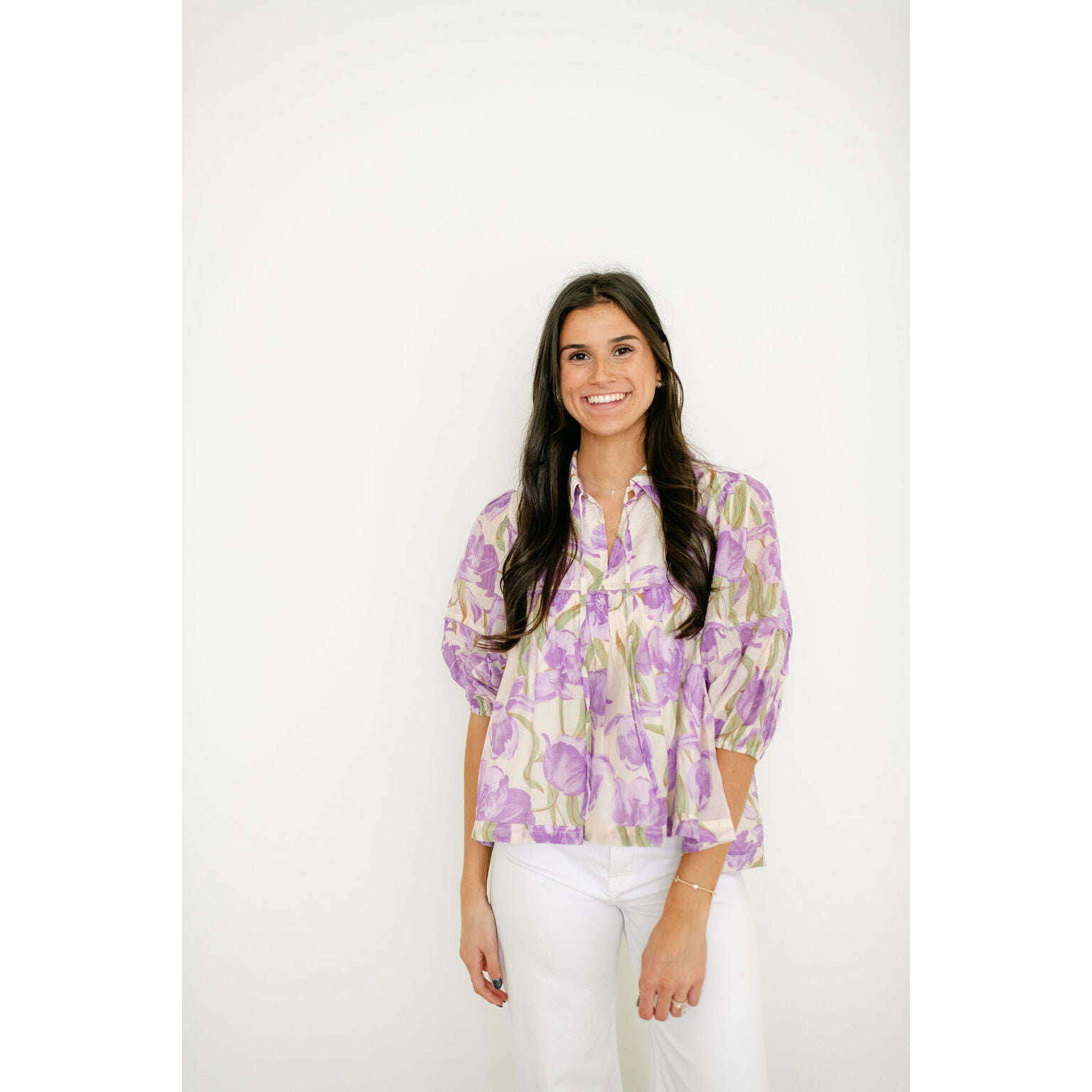 Wrap yourself in the painterly, romantic hues of Aphrodite's own garden. This stunning floral blouse captures the essence of a Grecian spring with its watercolor-inspired purple blooms. The effortless, tiered babydoll silhouette flows with every breezy step, while the collared tie-neck and romantic puff sleeves add a touch of timeless, feminine grace. It's the perfect top for a dreamy, sunlit day exploring the island.