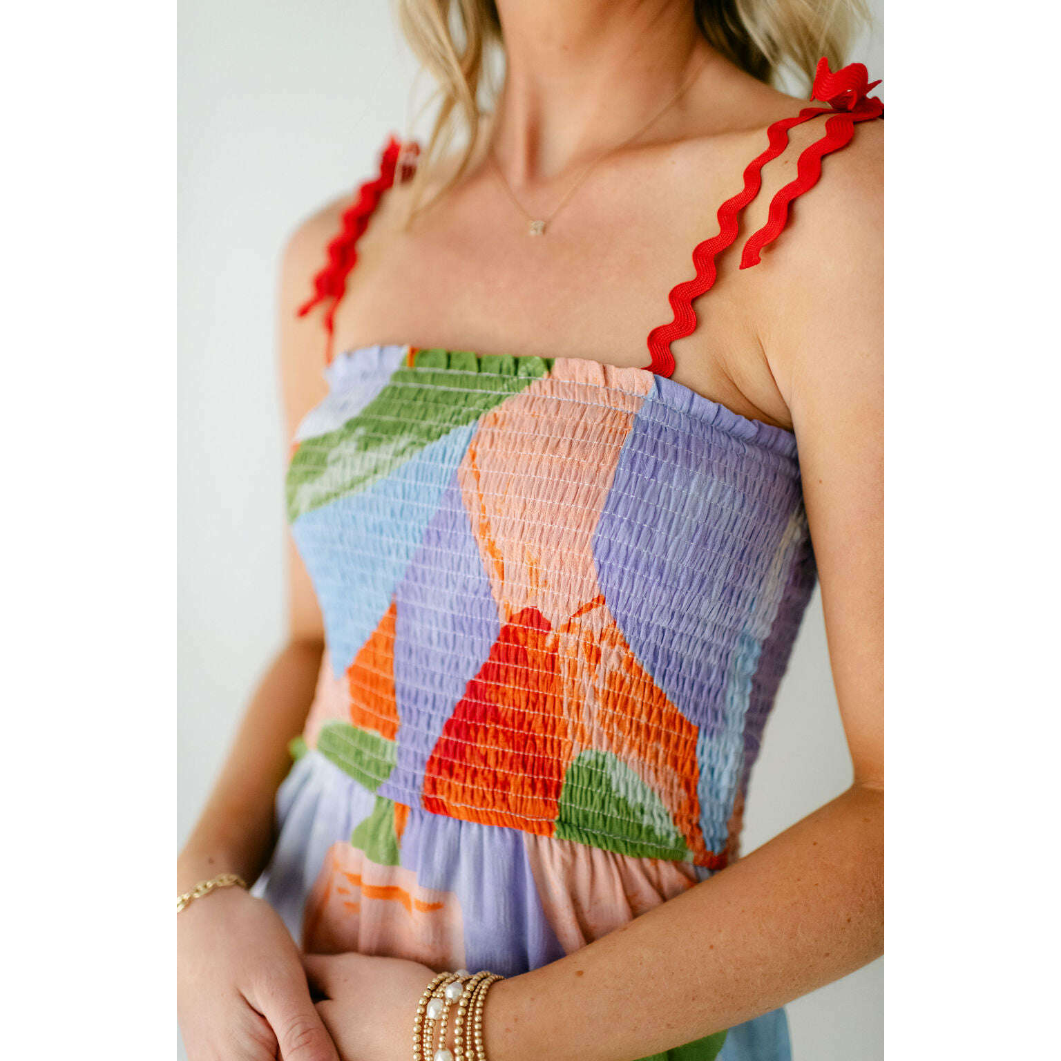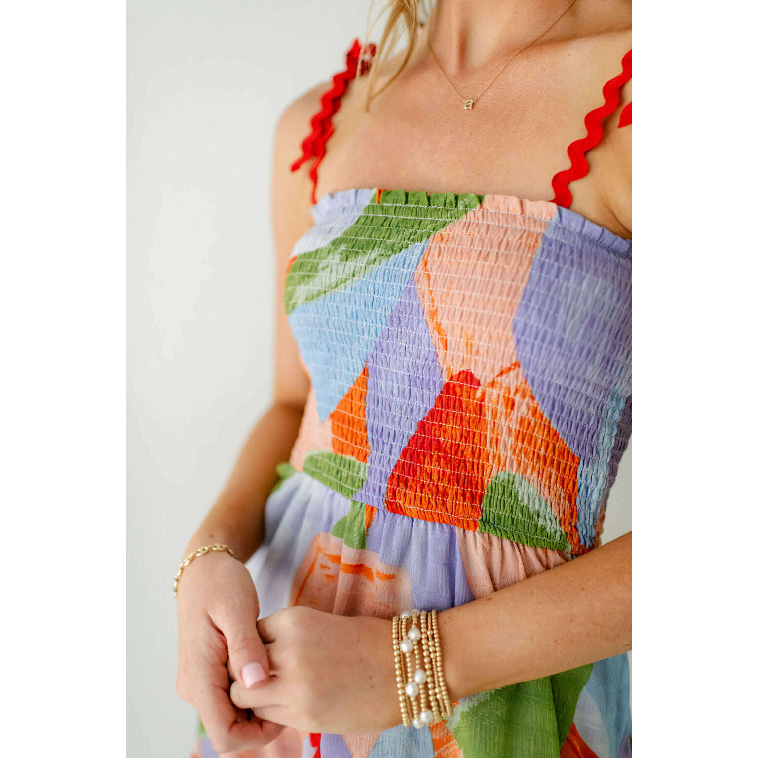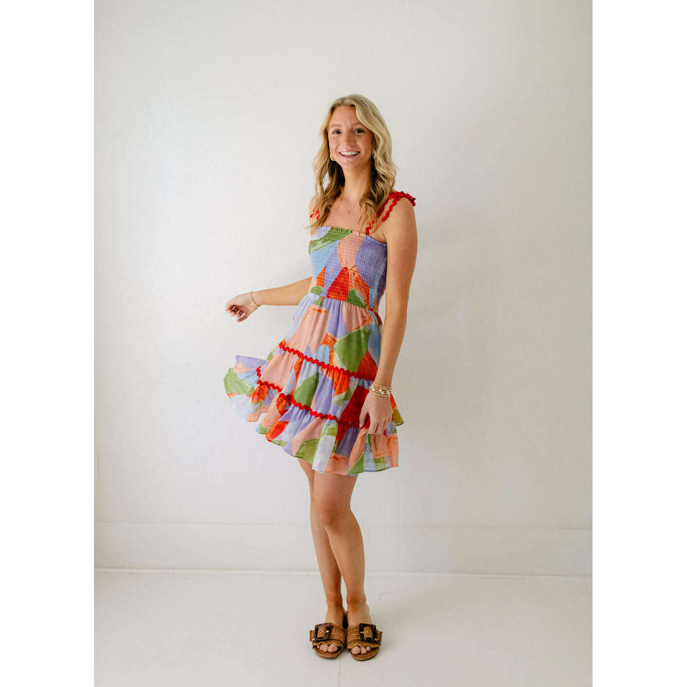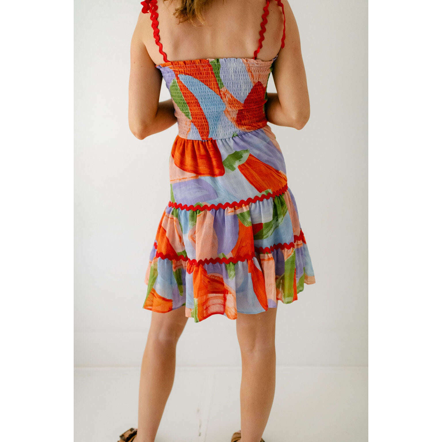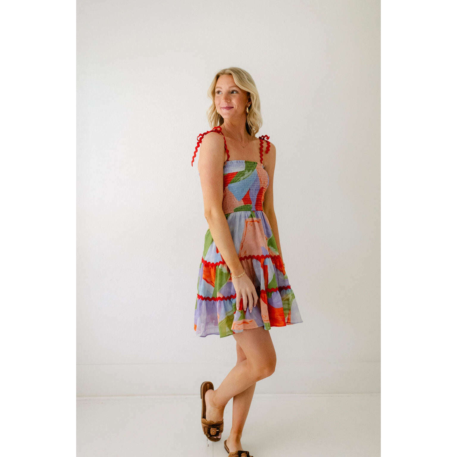 Get ready to turn heads in the Meet Me in Santorini Ella Dress! This playful and stylish dress features a fun, abstract coral print and unique ric rac detailing on the sleeves and skirt. Perfect for adding a touch of fun to your summer wardrobe!
