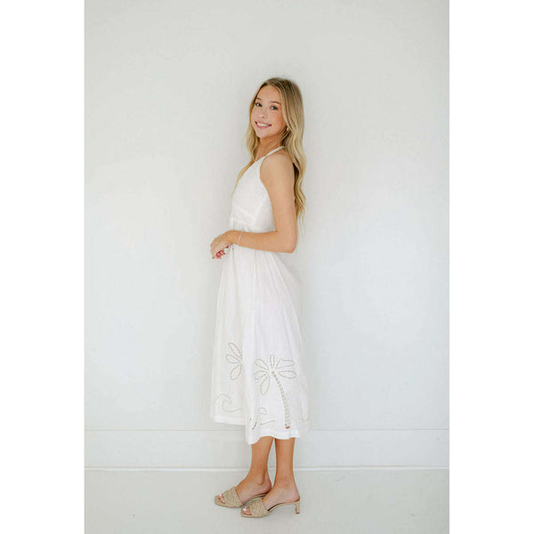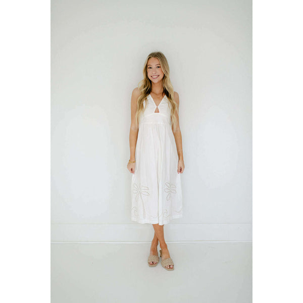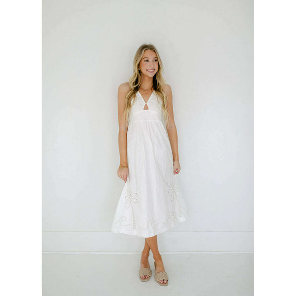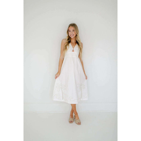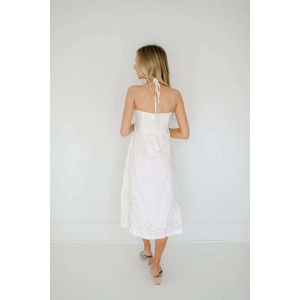 Delve into the essence of poolside chic, with the new-in Romina Broderie Midi Dress by MINKPINK. Featuring a relaxed shape & a crisp white colourway. Style yours with some neutral slides for an effortless beach to brunch look.- Halter neckline-...