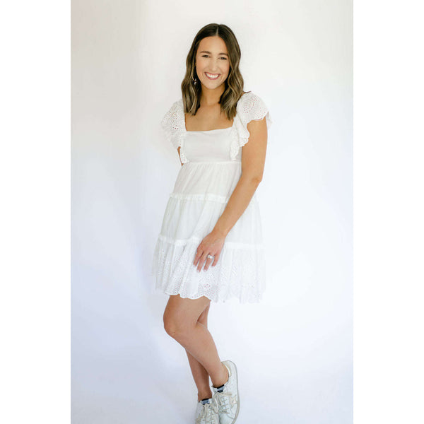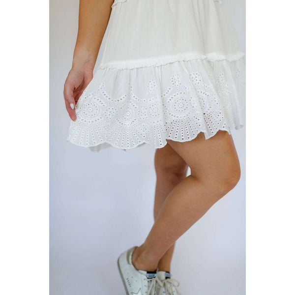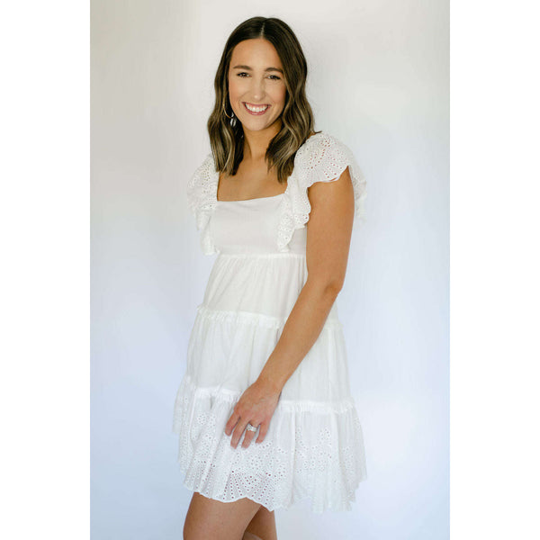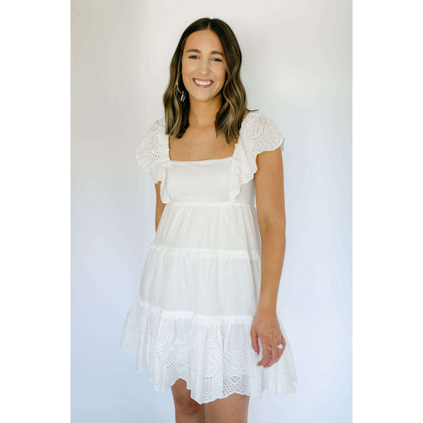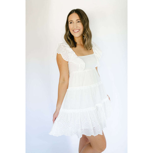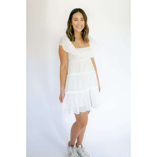 How pretty is our Mink Pink Starling Ruffled Mini Dress?! We love the eyelet detailing throughout this dress. It makes this piece extra special! Fits true to size, Caroline is wearing a size small. She is 5’7 and a size 4....