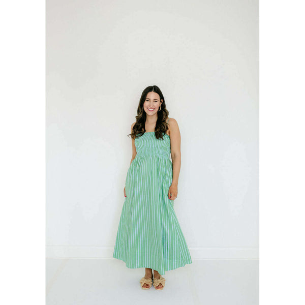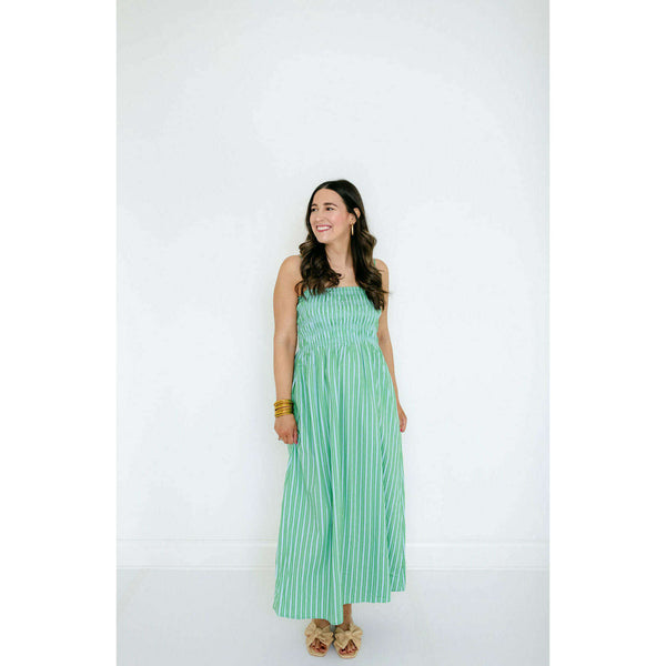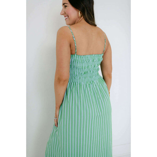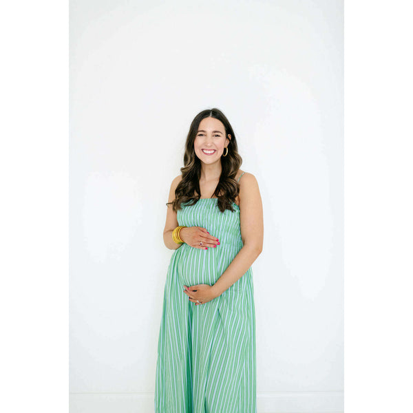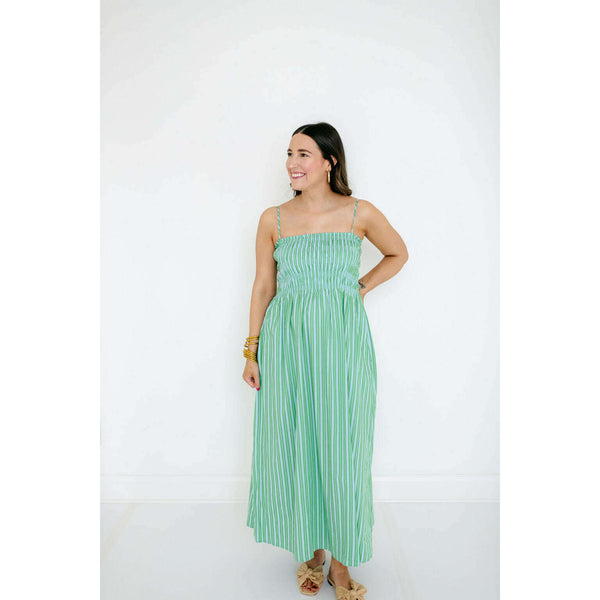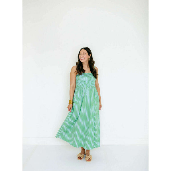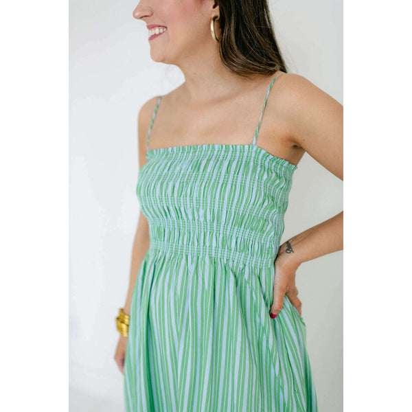 A warm-weather standout in a green and blue stripe, the Pistola Bianca pairs a fitted shirred bodice with a flowing, above-the-ankle skirt for a balanced, feminine silhouette. The cotton–spandex fabric delivers light stretch and breathability in a bright green and...