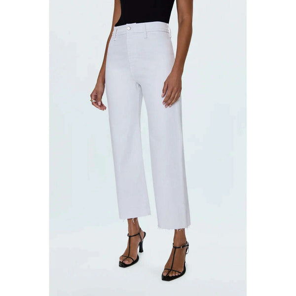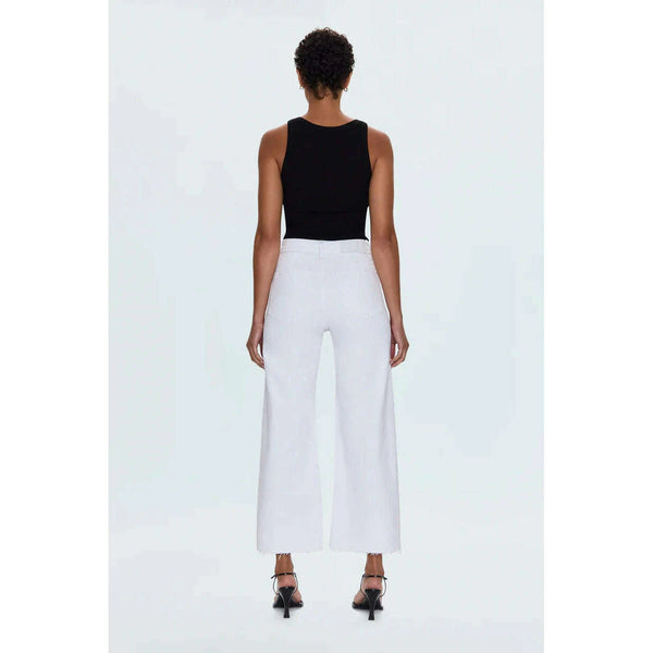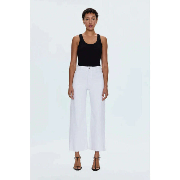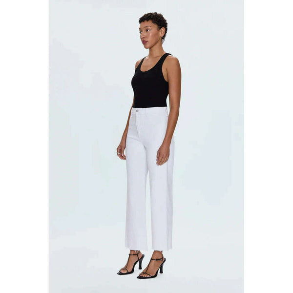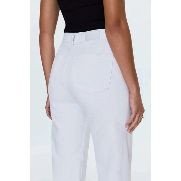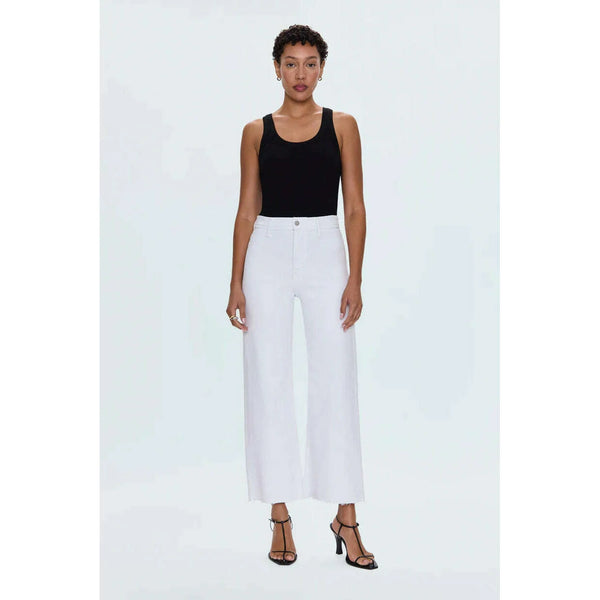 The white jean that changes everything. Penny Crop commands attention with a high-rise waist and wide leg silhouette that flows to a perfectly cropped ankle length, finished with a 27" inseam. Designed with no front pockets and no outer seams...