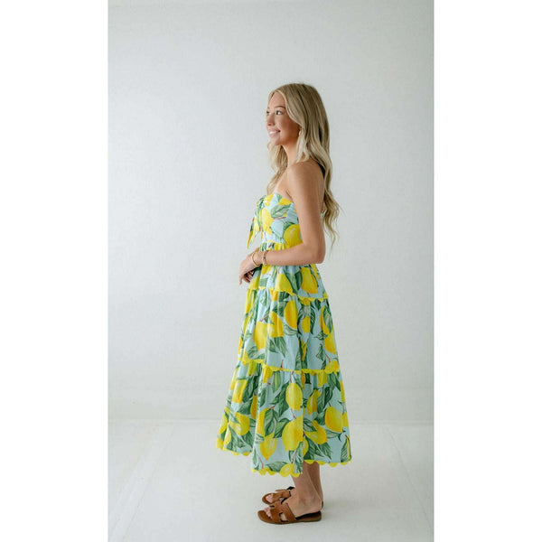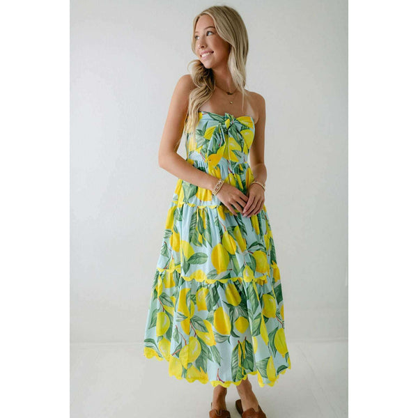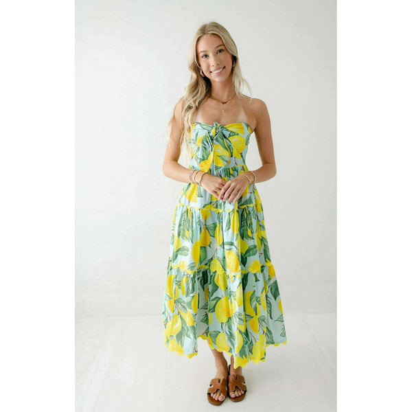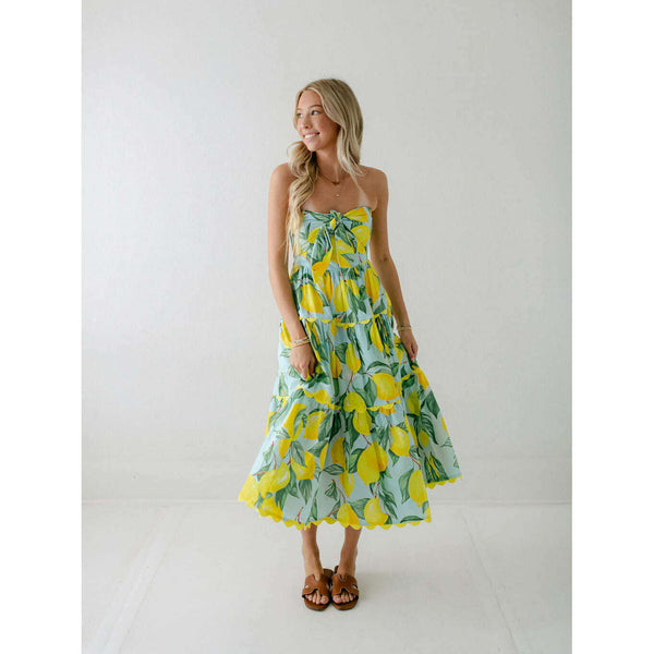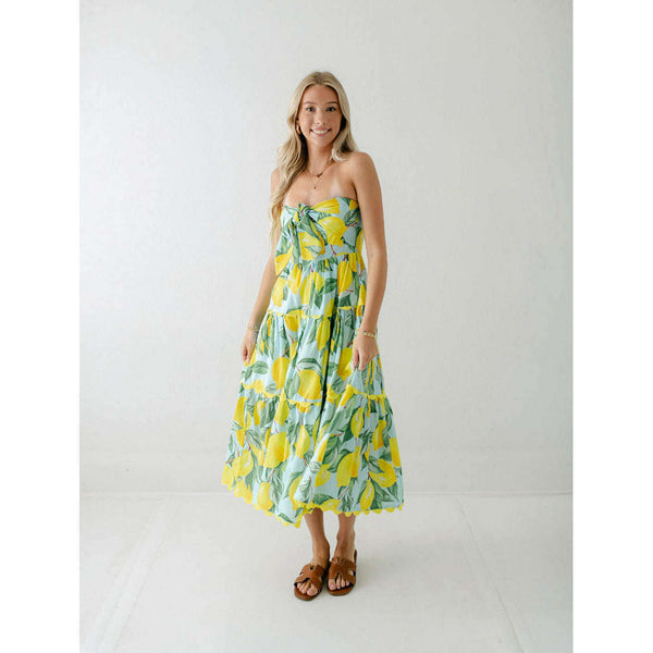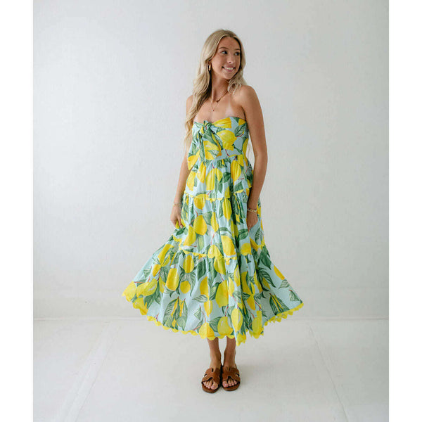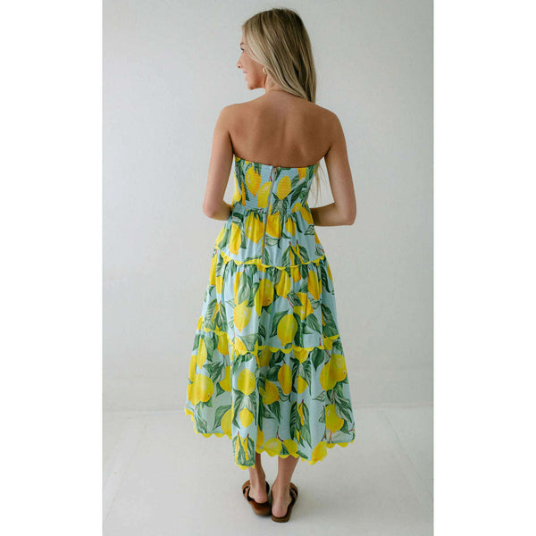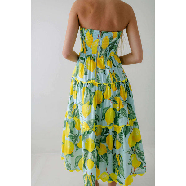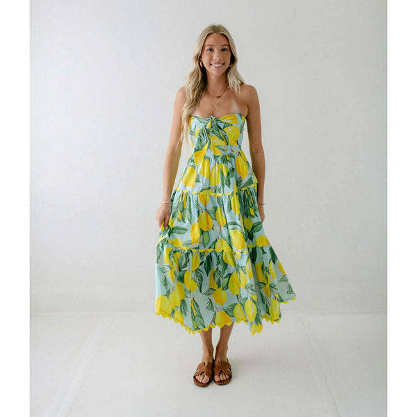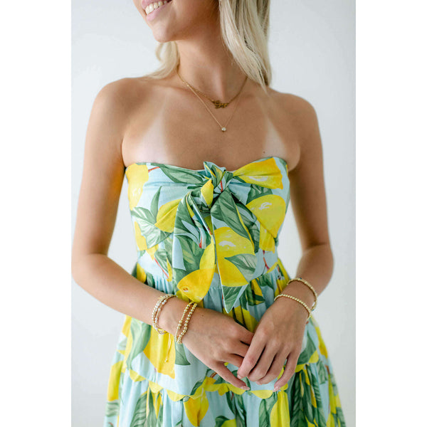 Meet the Prosperina Elena Blue Lemon Print Linen Strapless Midi Dress. With its citrus charm and breezy fabric, it’s made for sunny days! This blue lemon dress features a strapless design, a self-tie front bow, a smocked back panel, gold...