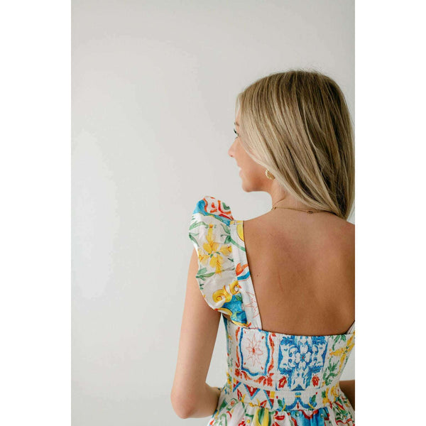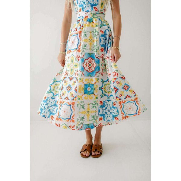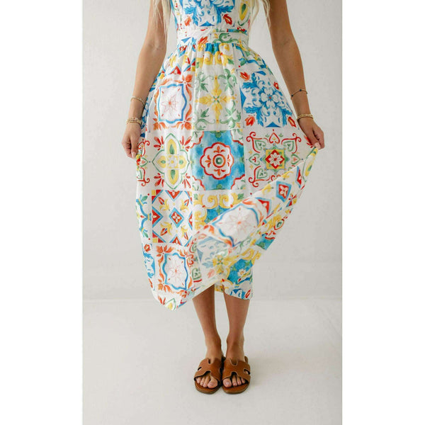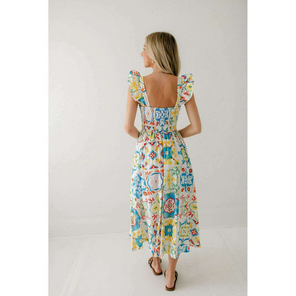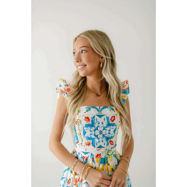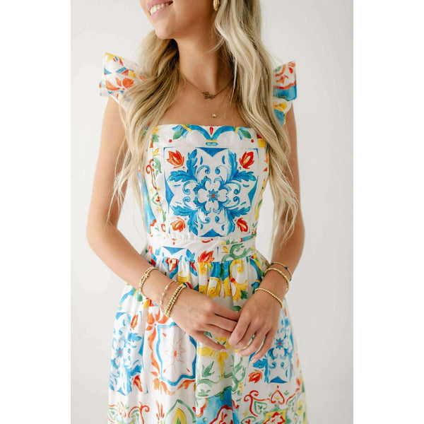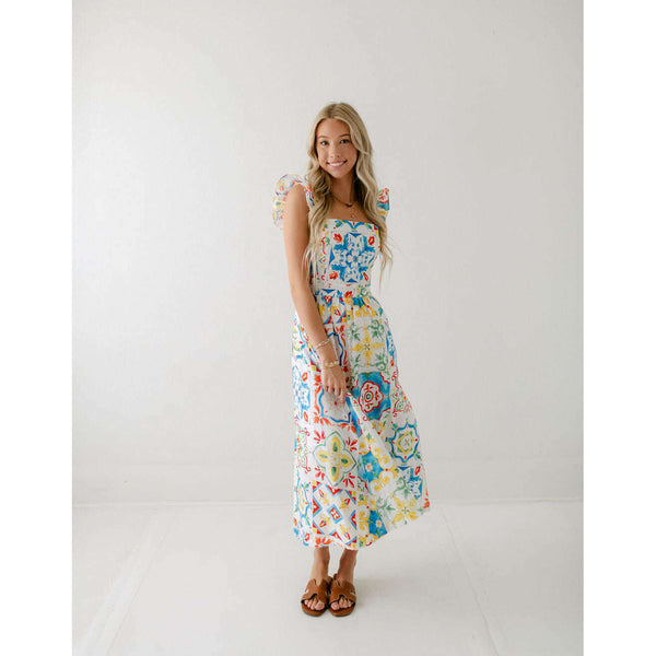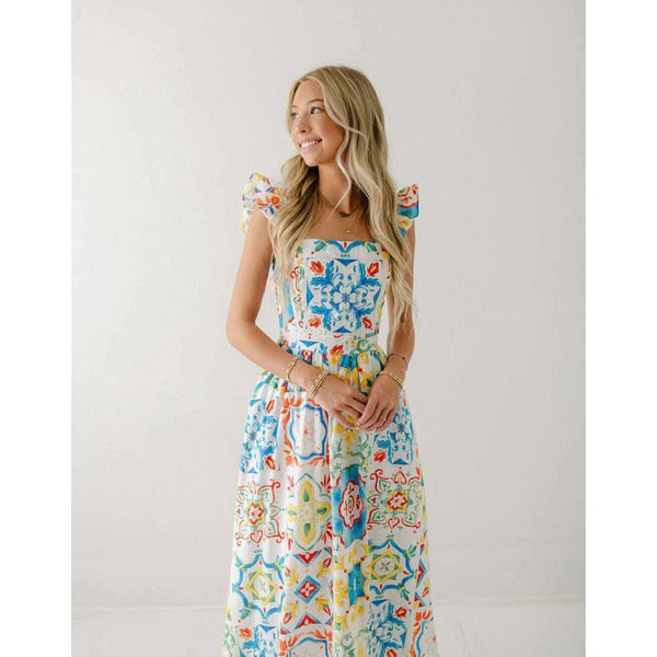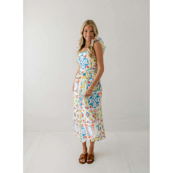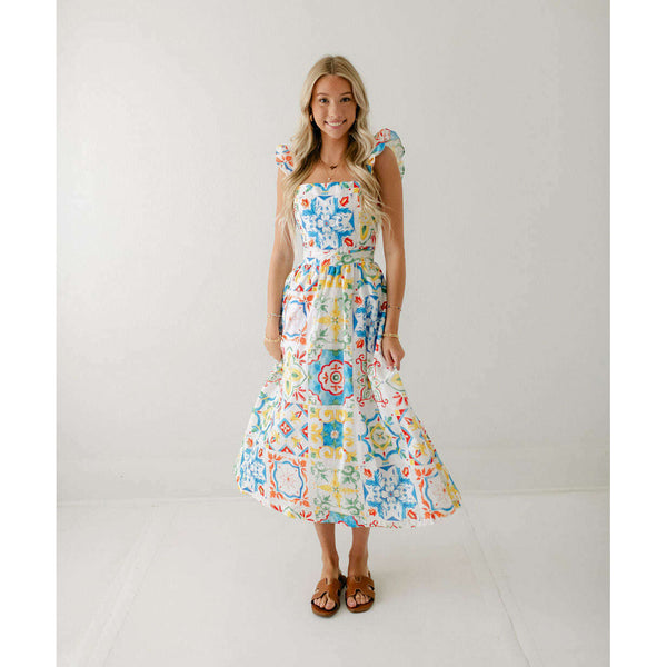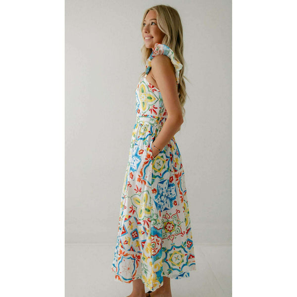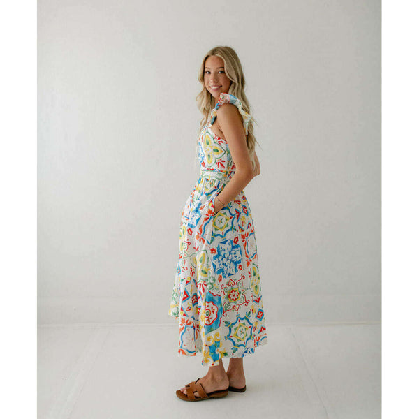 Designed with a beautiful Sicilian tile print, the Prosperina Nicola Midi Dress is perfect for any summer occasion. Made from high-quality linen, this dress features a playful ruffle detail that adds a touch of femininity. Stay stylish and comfortable all...