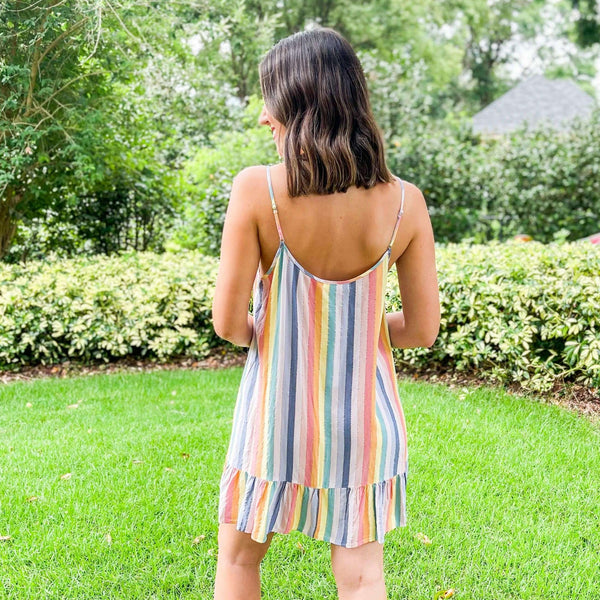 We are loving this Self Contrast Summer Rainbow dress! It is so fun and the perfect piece for your summer wardrobe. Self Contrast is is a brand that is made in the United States! Fits true to size, Caroline is...