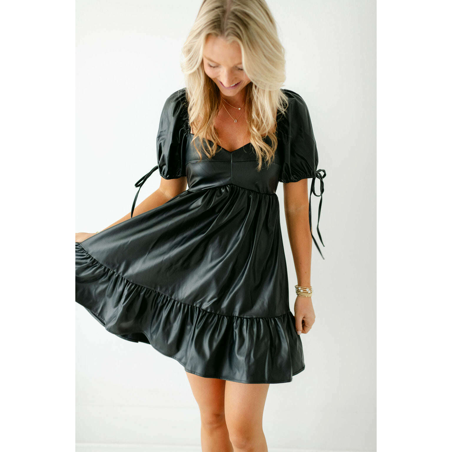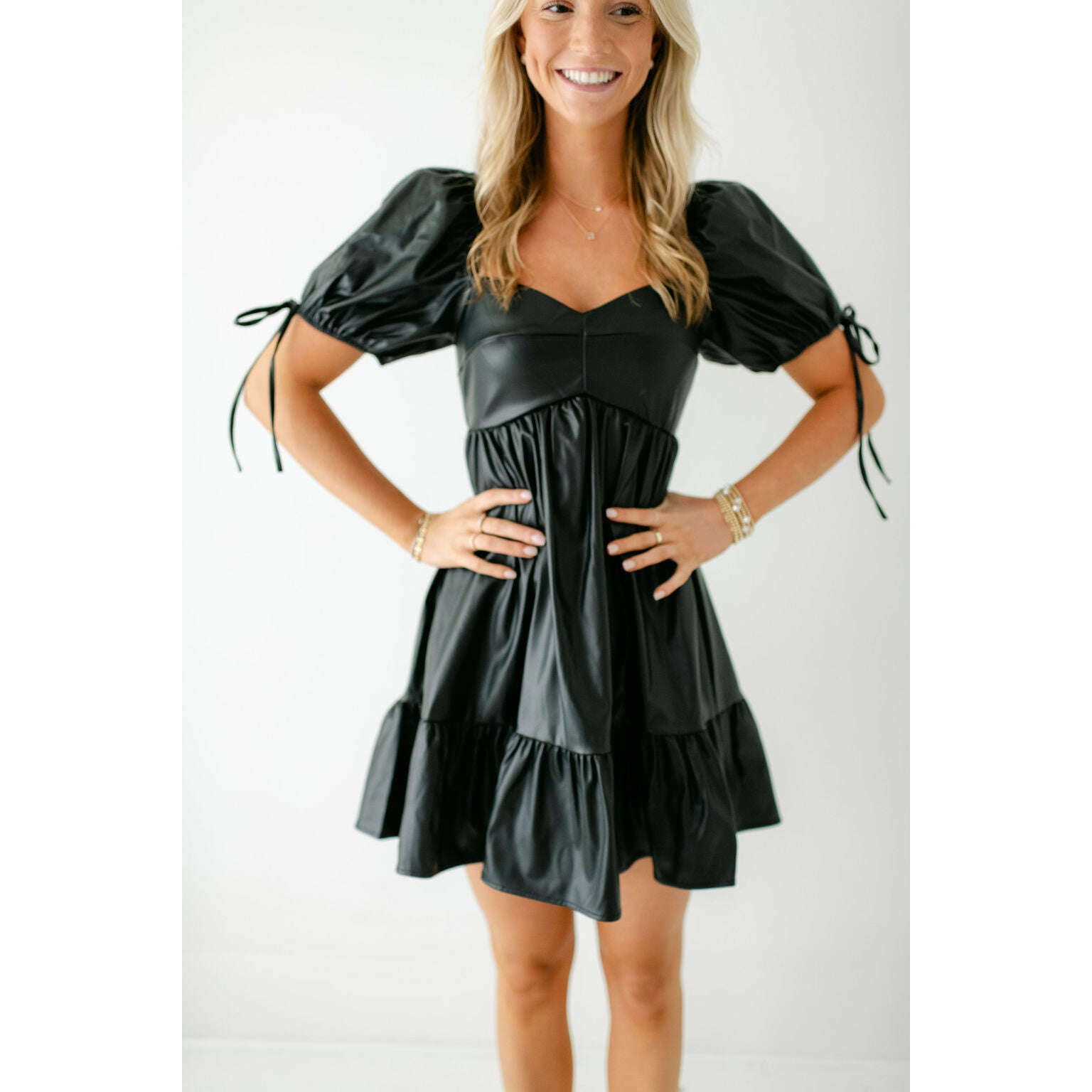 Get ready to turn heads with the Sincerely Ours Beth Faux Leather Mini Dress in Black. With its unique tie detailing and trendy puff sleeves, this dress is not only cute but also a perfect choice for fall. Whether pairing it with boots or wearing it to game day, this dress will make you stand out in style.