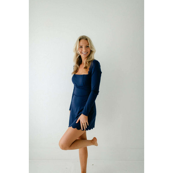 Get ready to turn heads with The Ellie Scallop Mini Dress! With its adorable scalloped detailing and cute navy color, this dress is perfect for any occasion. Whether you're running errands or just looking to make a statement, this exercise...