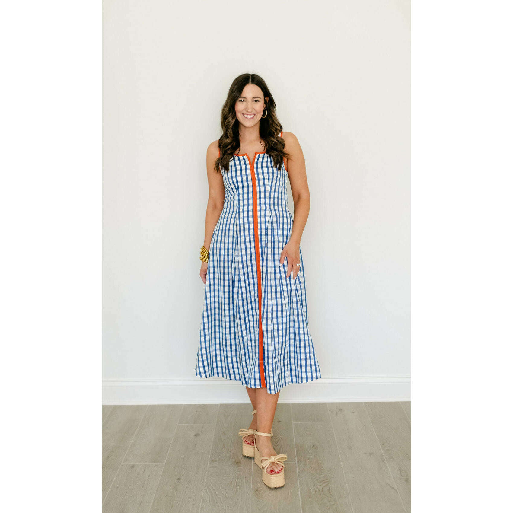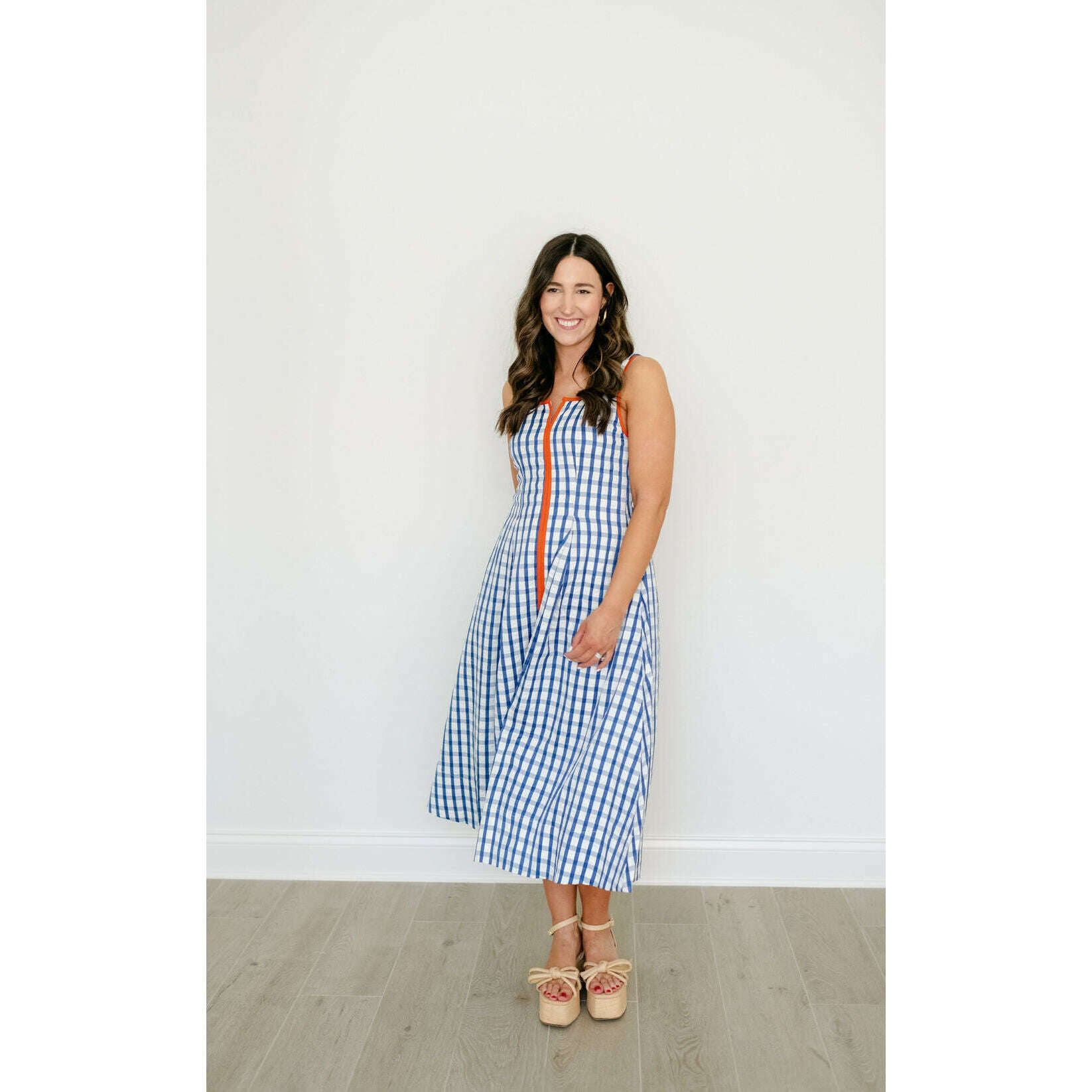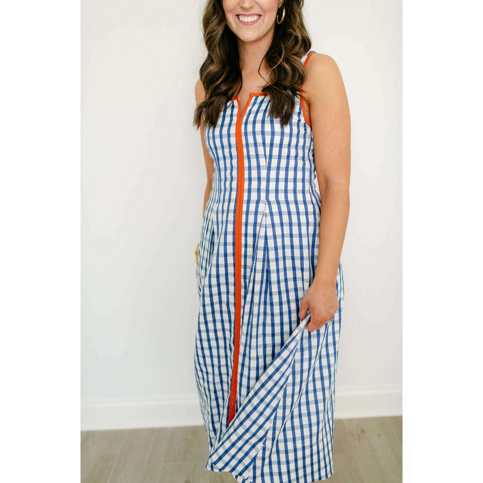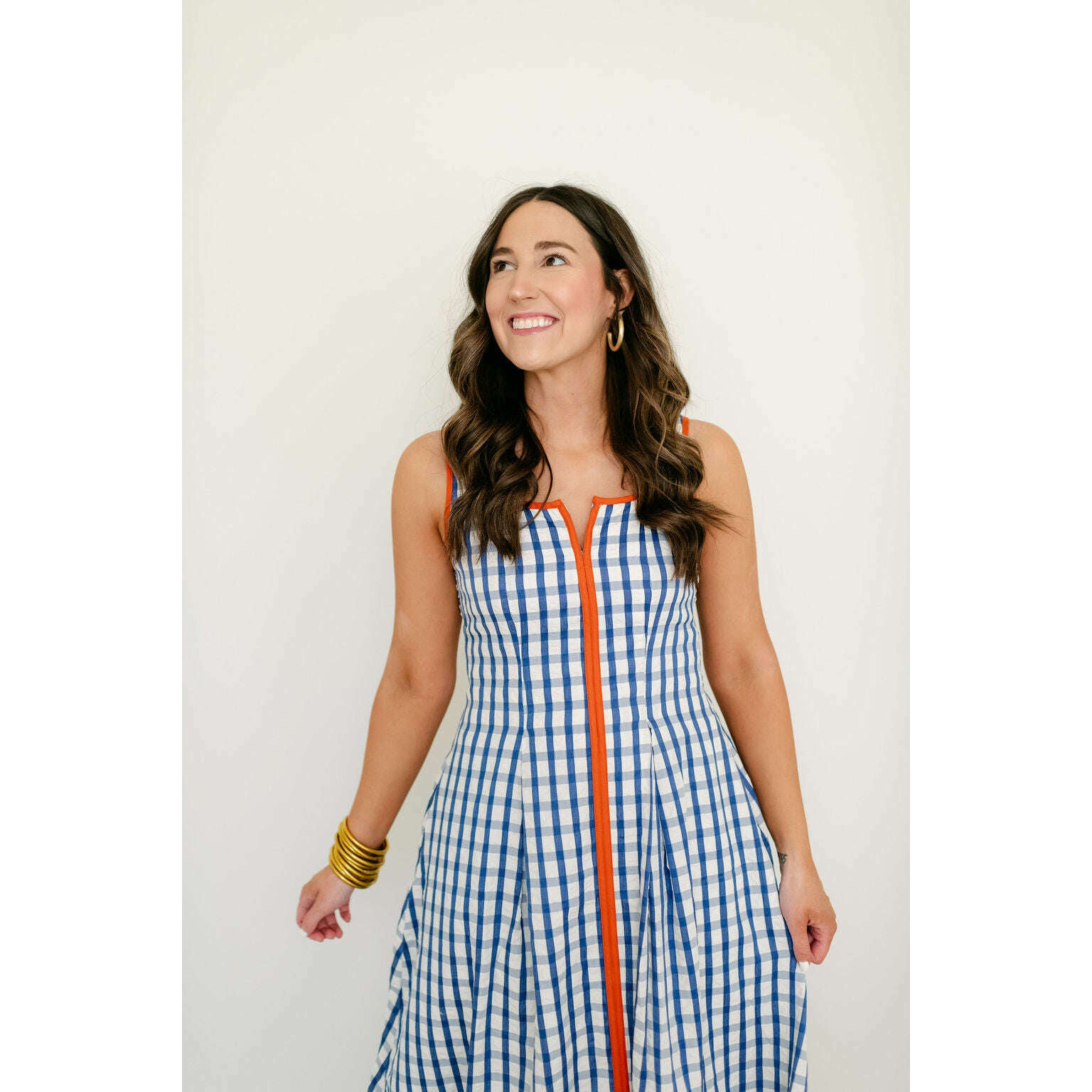 The THML Blue and White Gingham Dress with Orange Stripe combines classic gingham charm with a bold orange accent stripe that instantly elevates your wardrobe. This adorable dress strikes the perfect balance between preppy and modern, making it an easy go-to for any occasion.