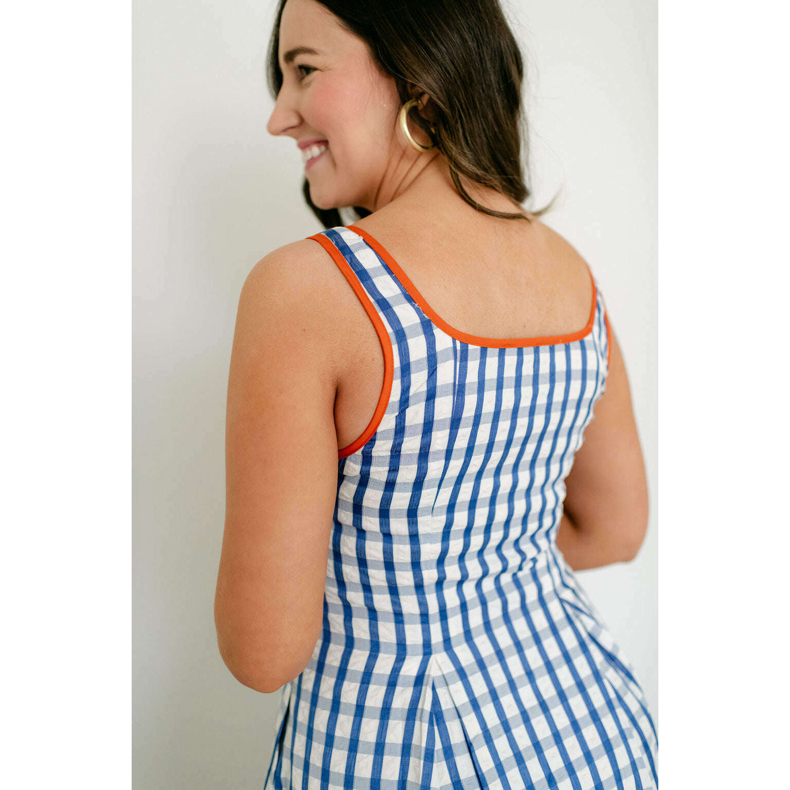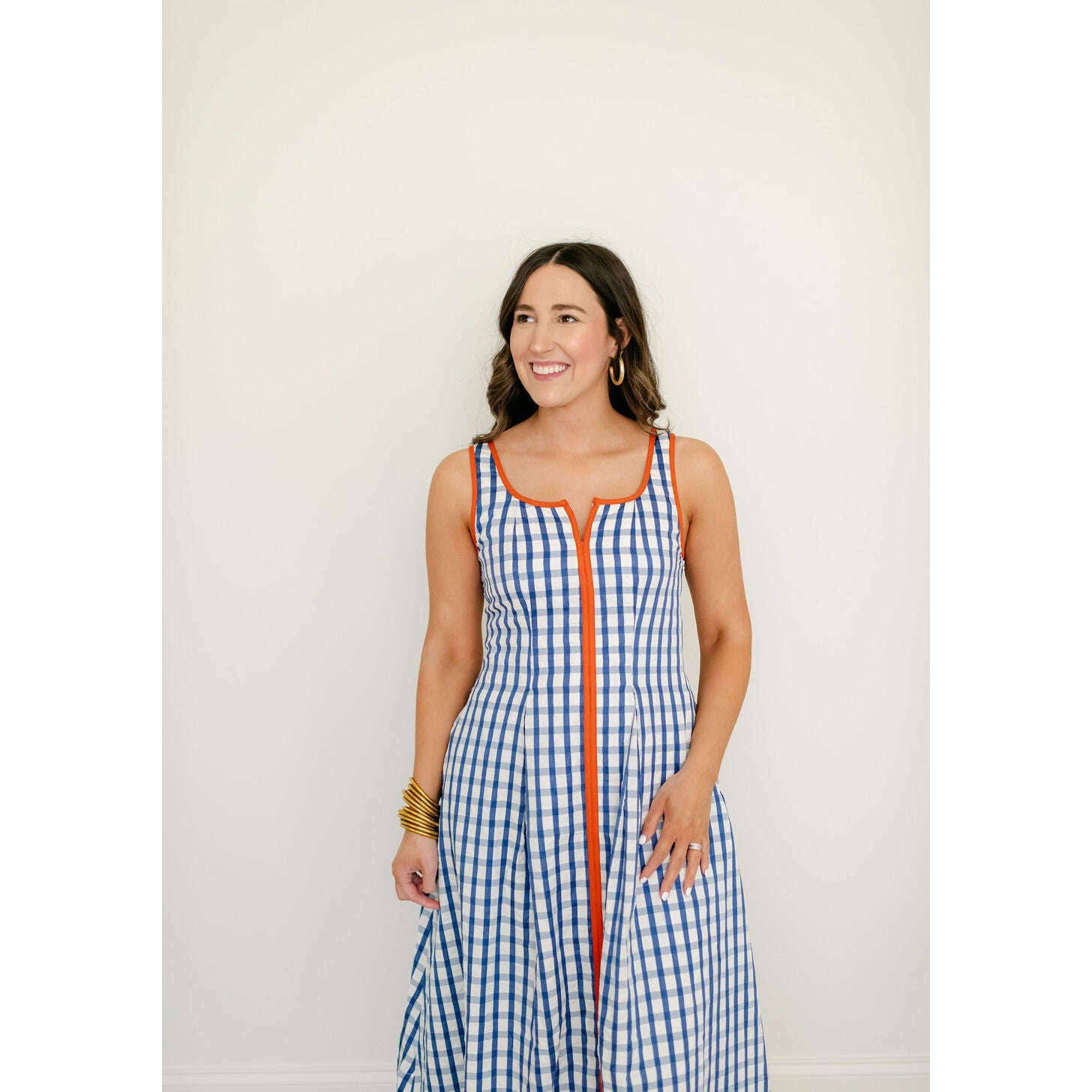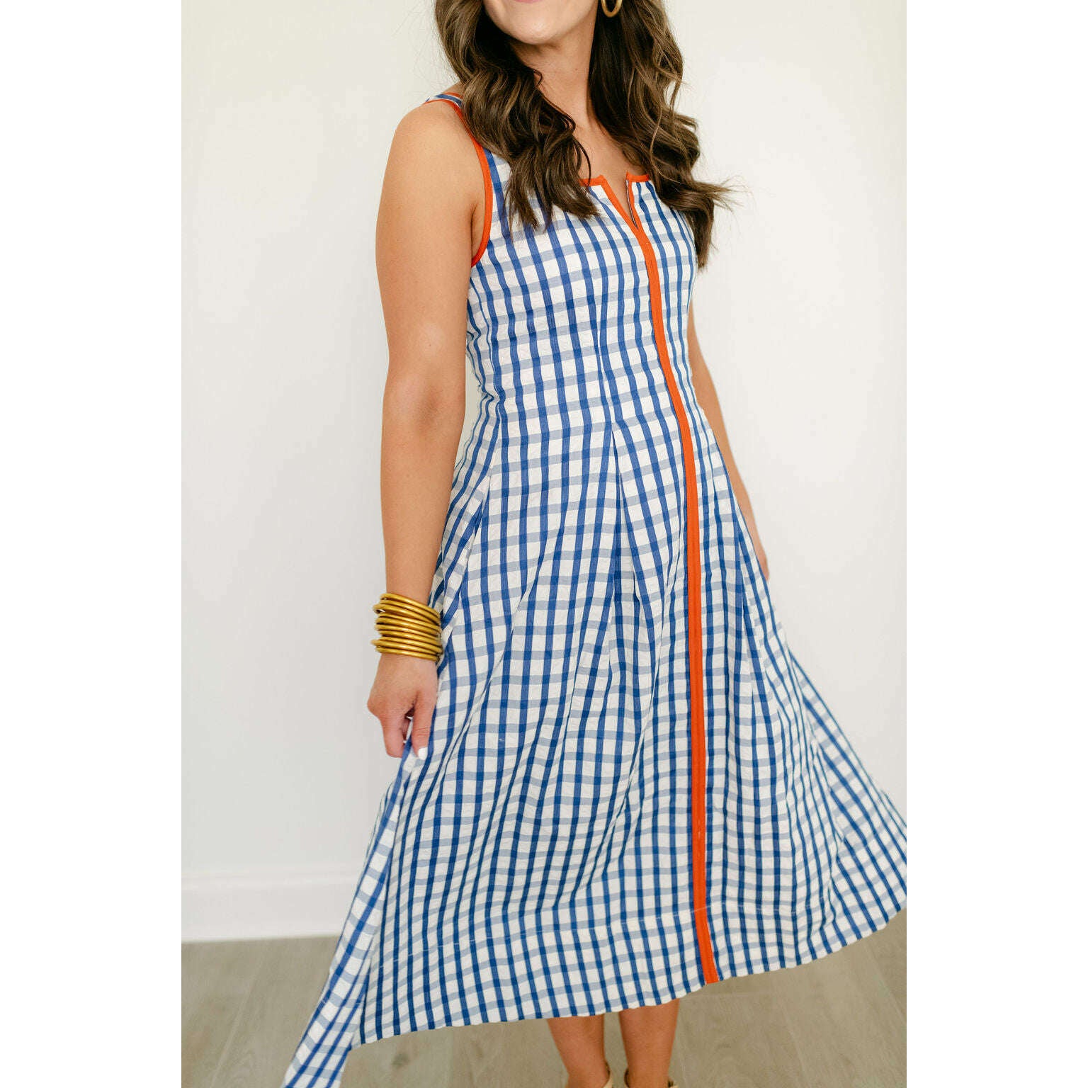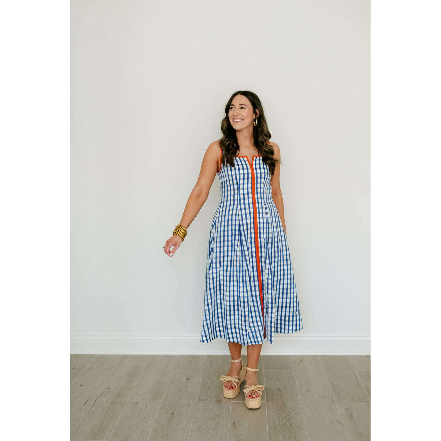 The THML Blue and White Gingham Dress with Orange Stripe combines classic gingham charm with a bold orange accent stripe that instantly elevates your wardrobe. This adorable dress strikes the perfect balance between preppy and modern, making it an easy go-to for any occasion.
