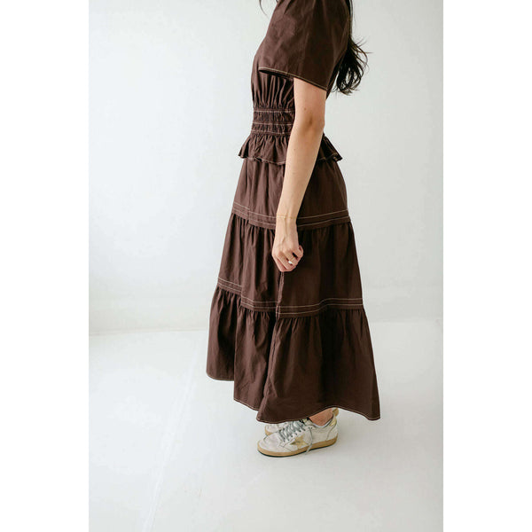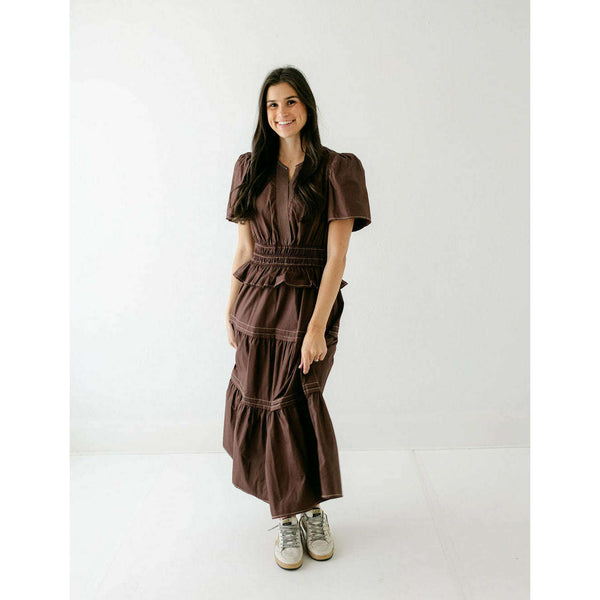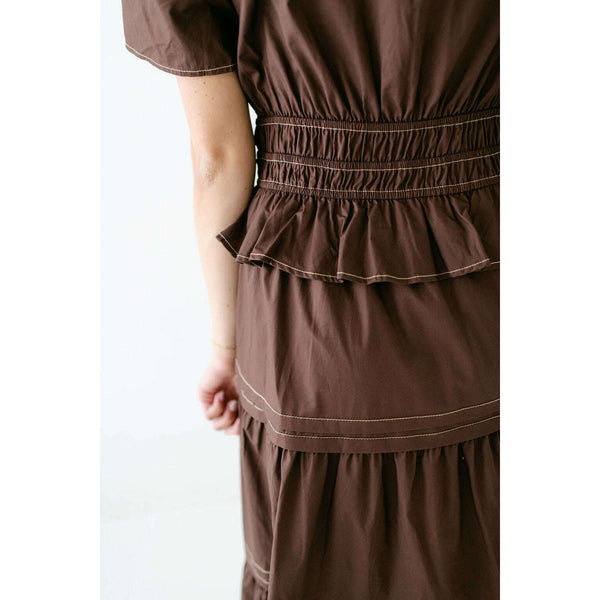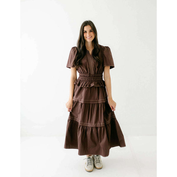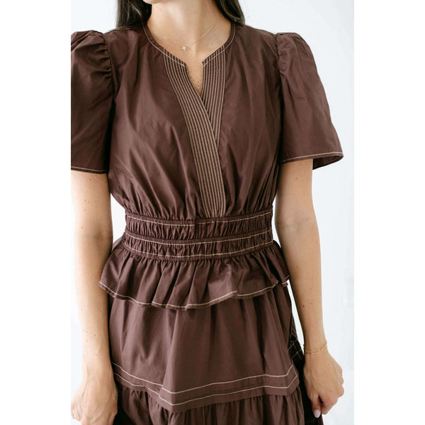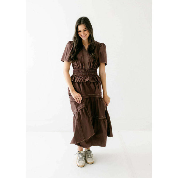 Elevate your autumn collection with this THML stunning brown midi dress that perfectly captures the season's warmth and elegance. The v-neckline and tiered layers create a dynamic silhouette that flatters every frame, while the short sleeves and rich brown tone...