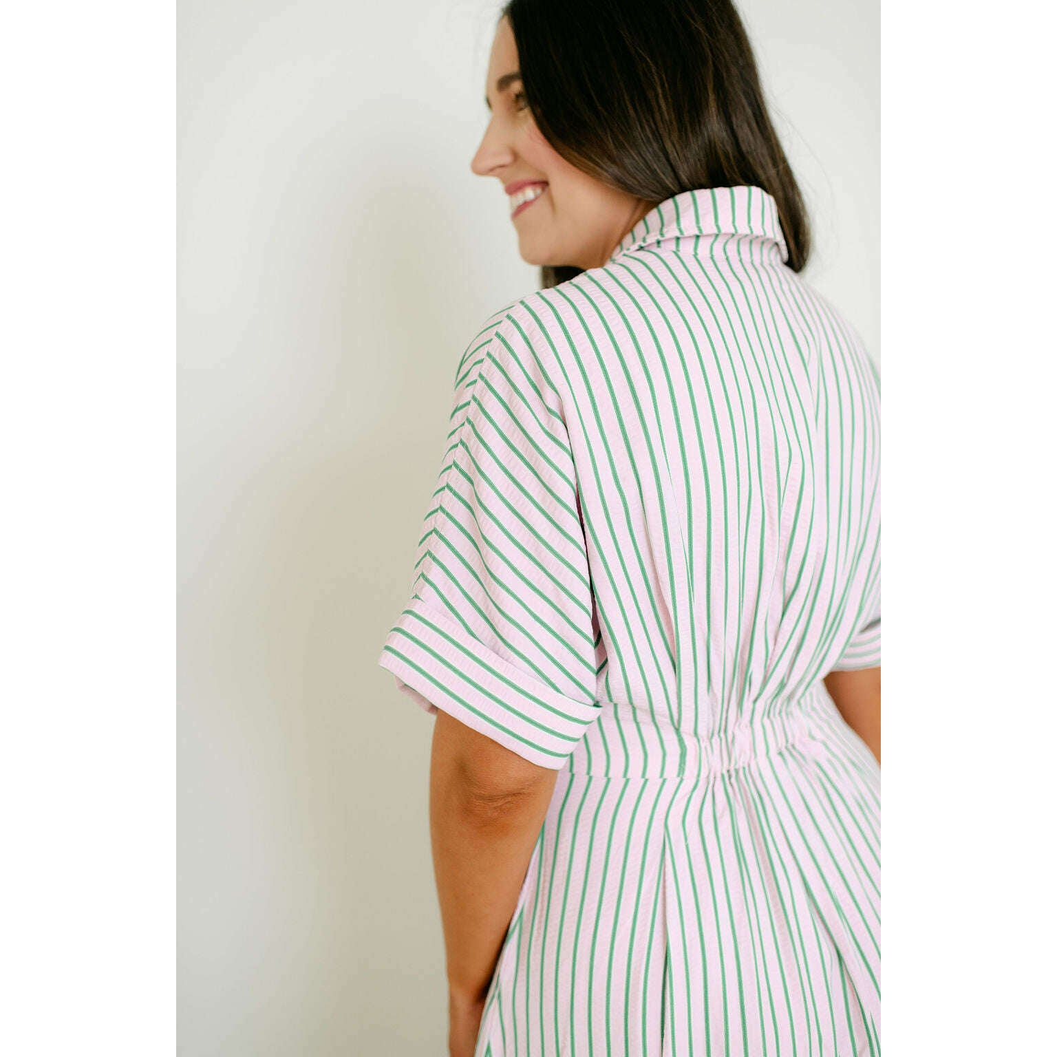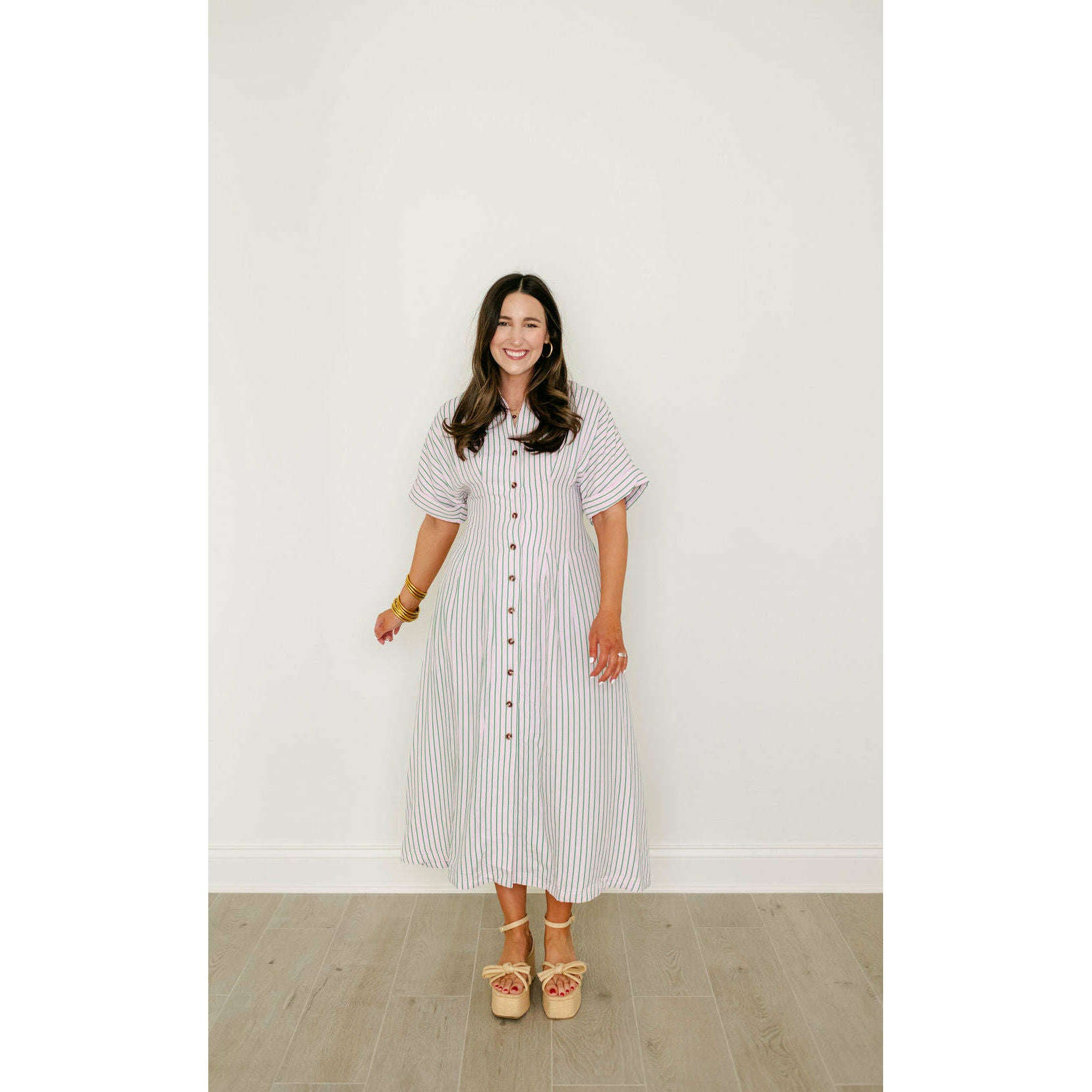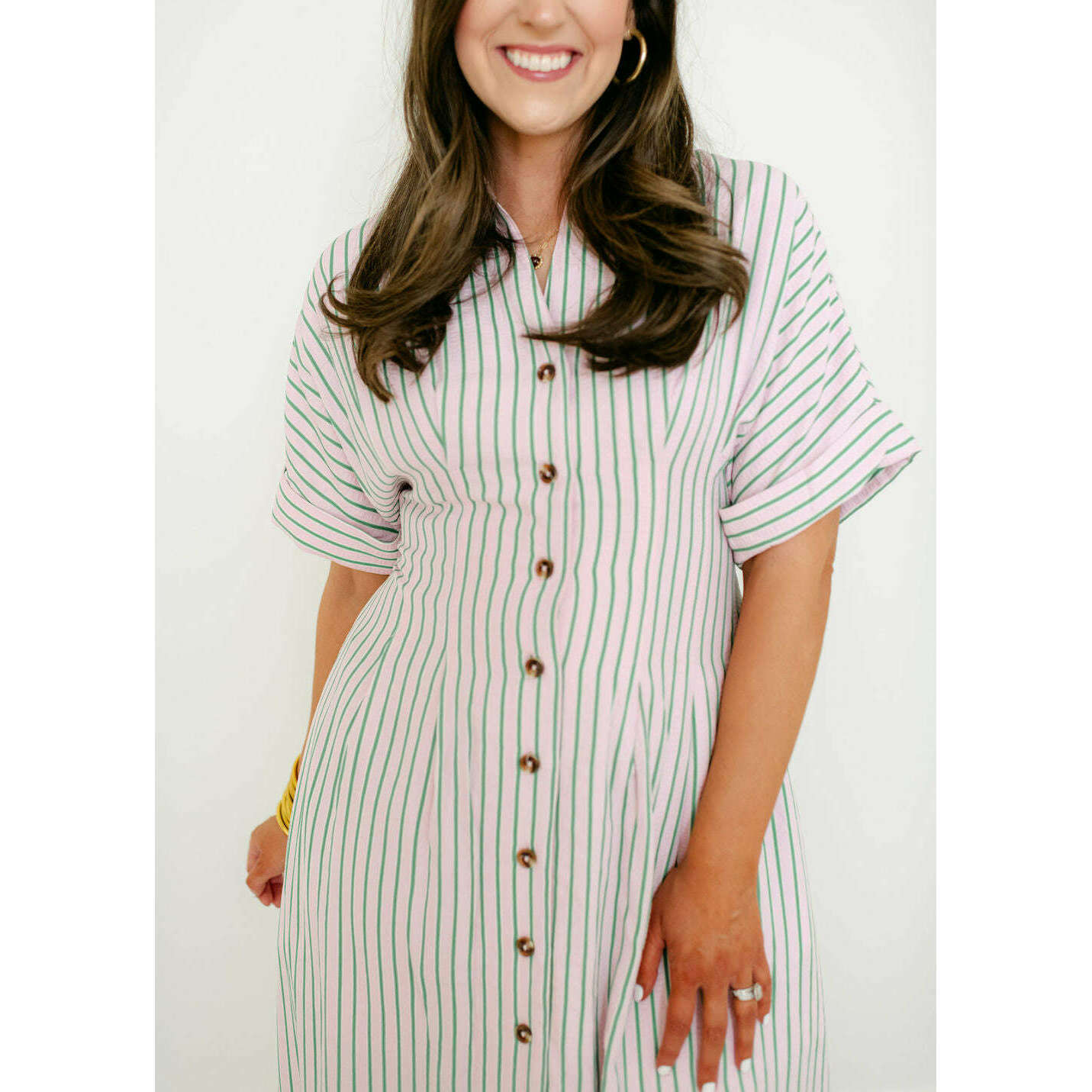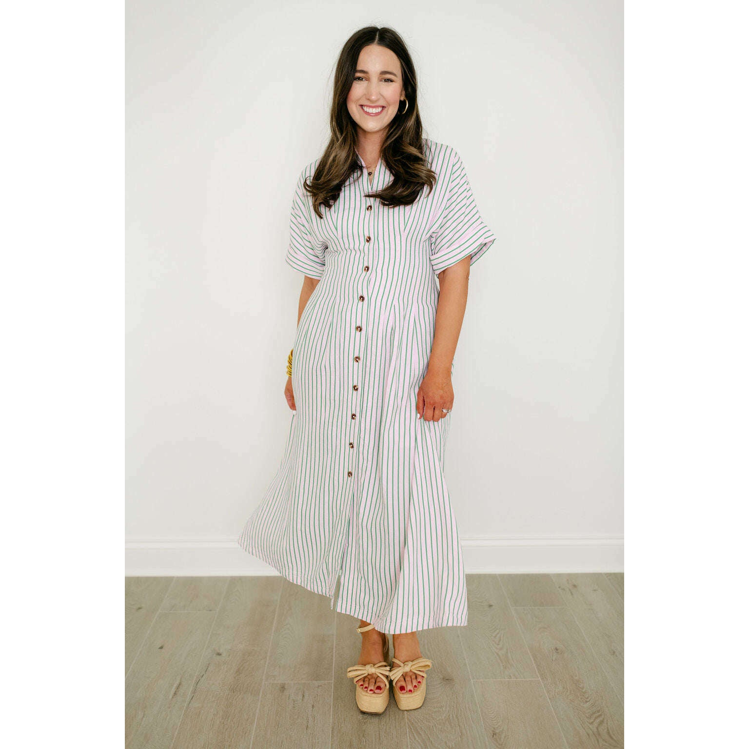 Elevate your spring collection with this irresistible THML midi dress, featuring a captivating pink and green stripe pattern that brings instant joy to your everyday style. The classic button-down design pairs beautifully with the vibrant color combination, creating a look that's both polished and playfully charming for any occasion.