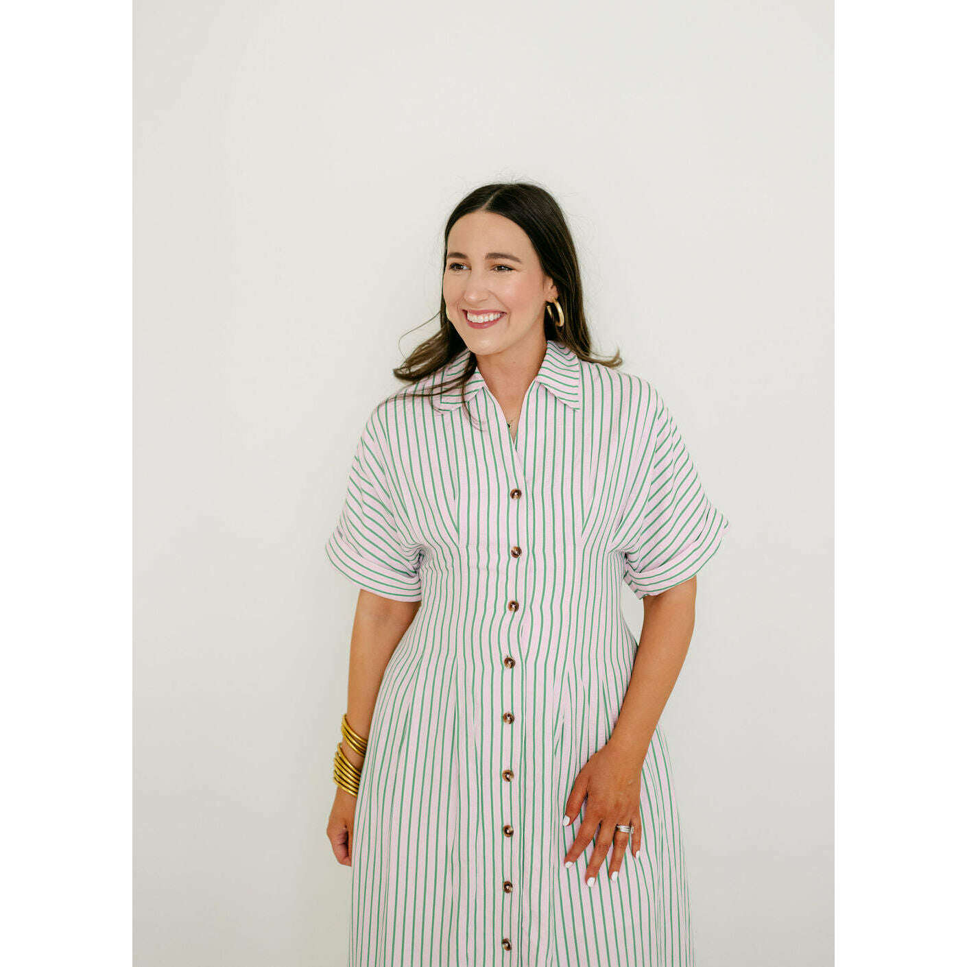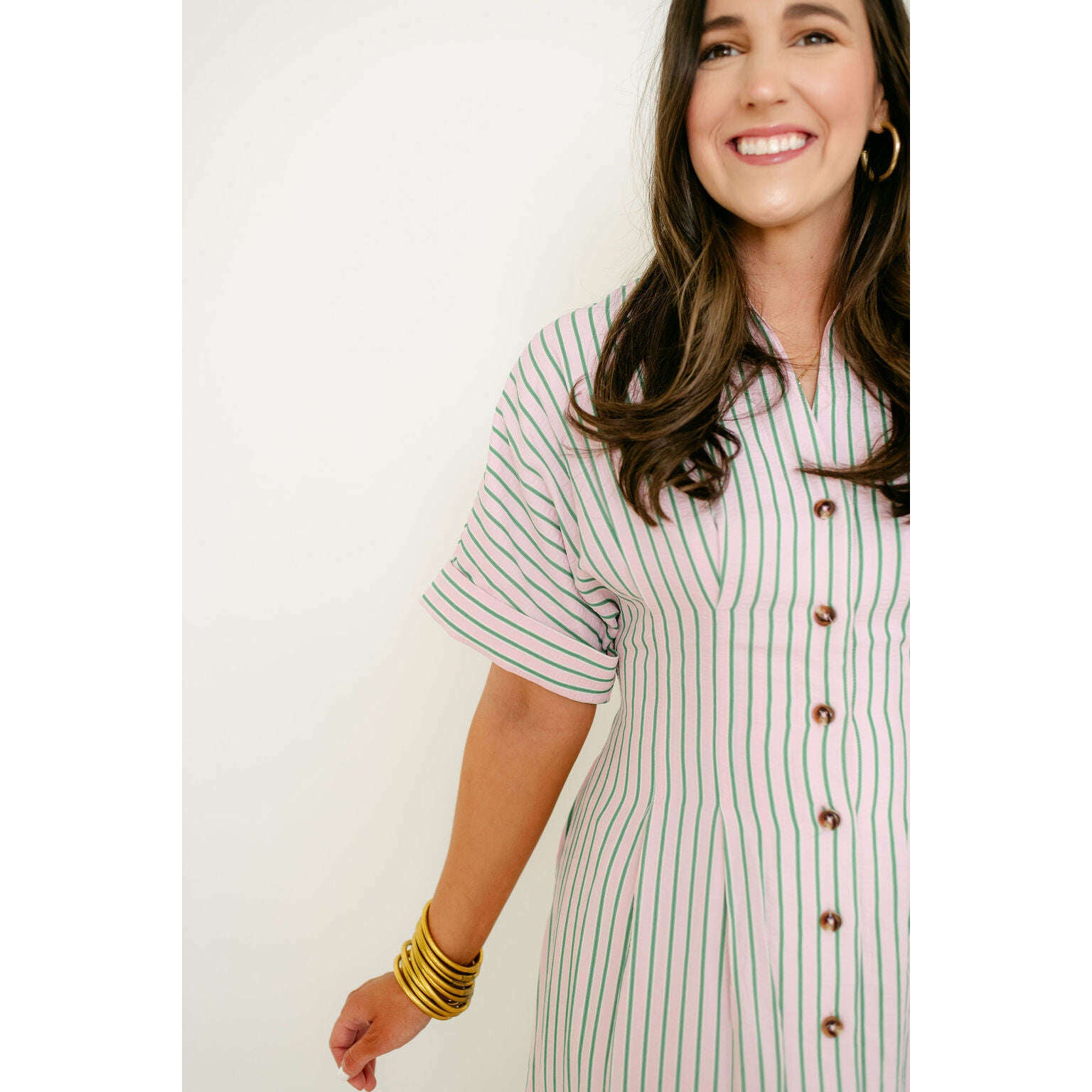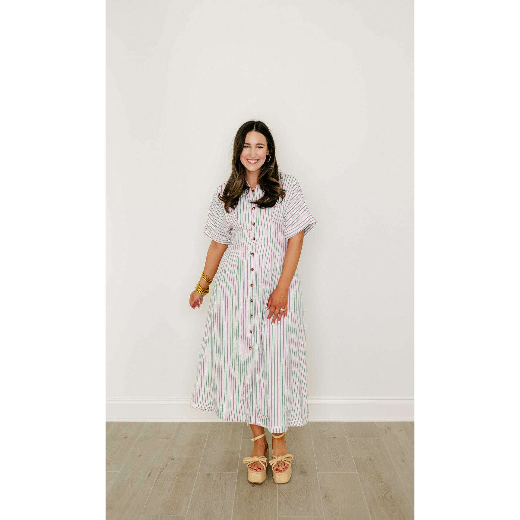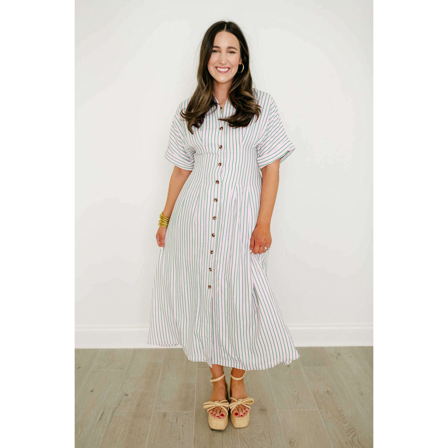 Elevate your spring collection with this irresistible THML midi dress, featuring a captivating pink and green stripe pattern that brings instant joy to your everyday style. The classic button-down design pairs beautifully with the vibrant color combination, creating a look that's both polished and playfully charming for any occasion.