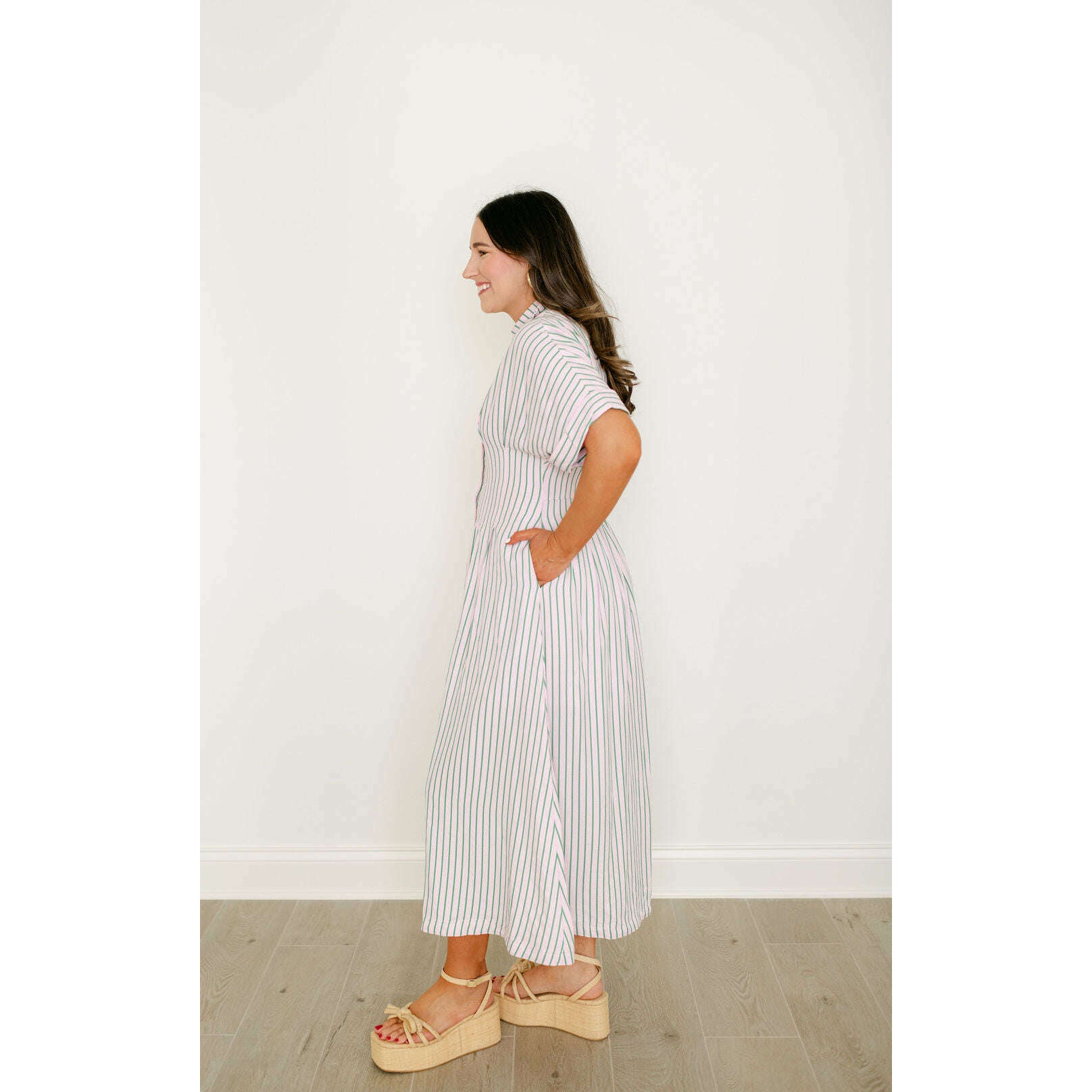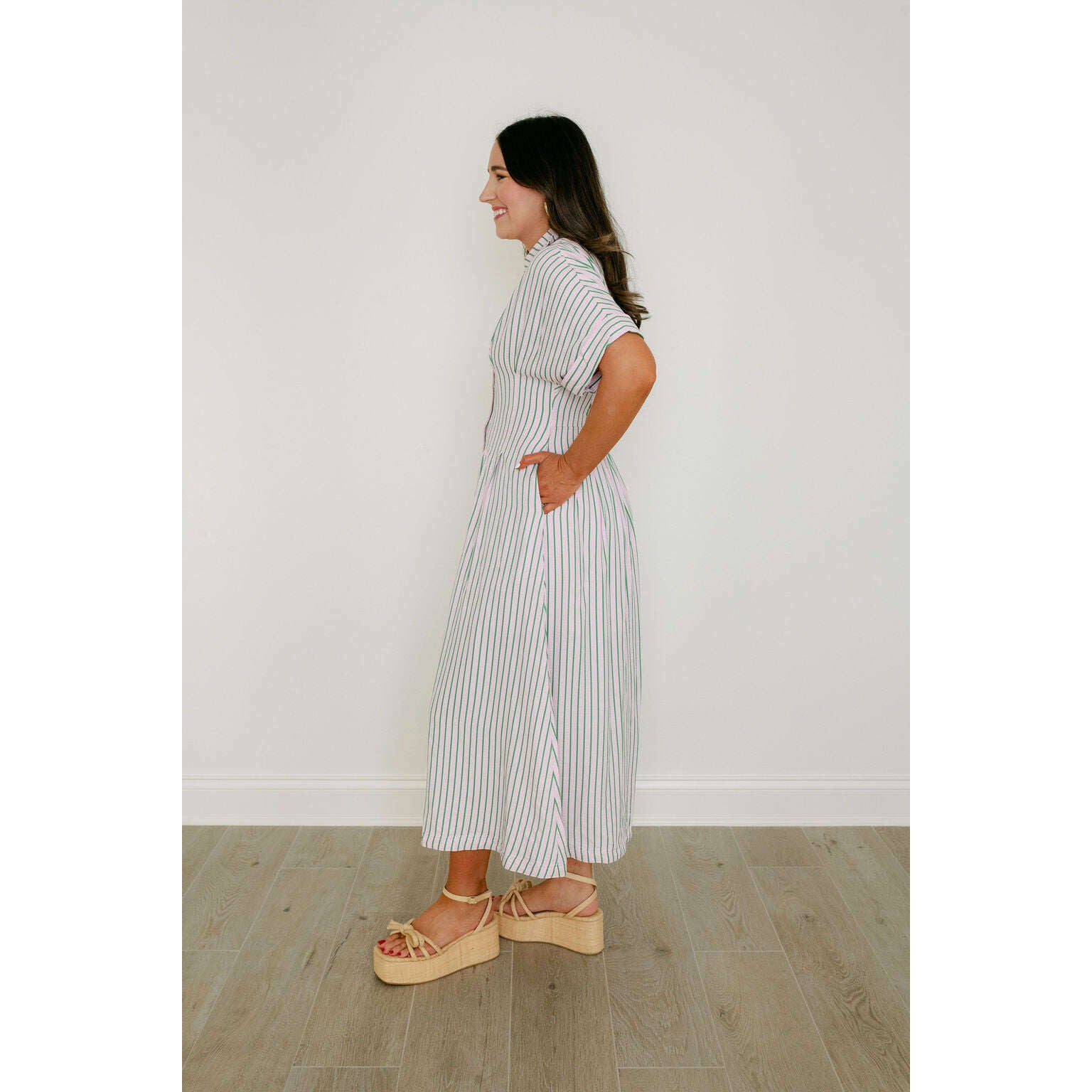 THML Pink and Green Stripe Button Down Midi Dress