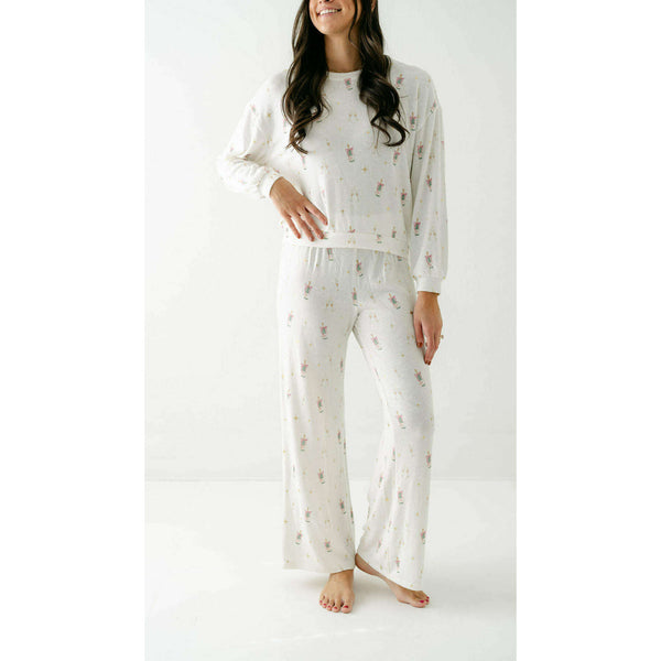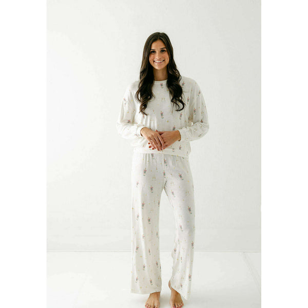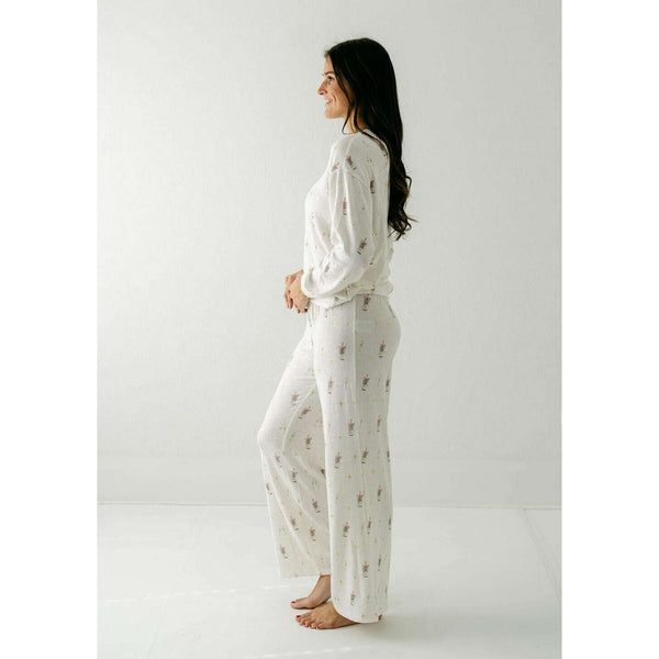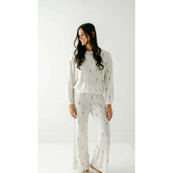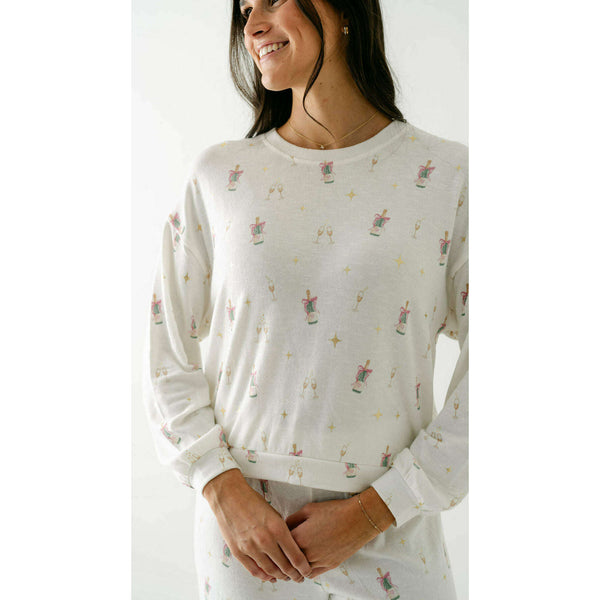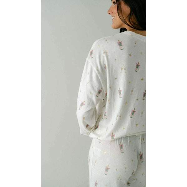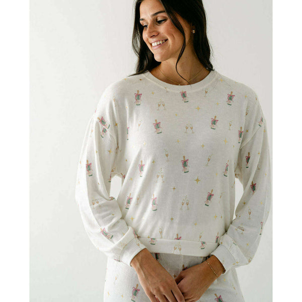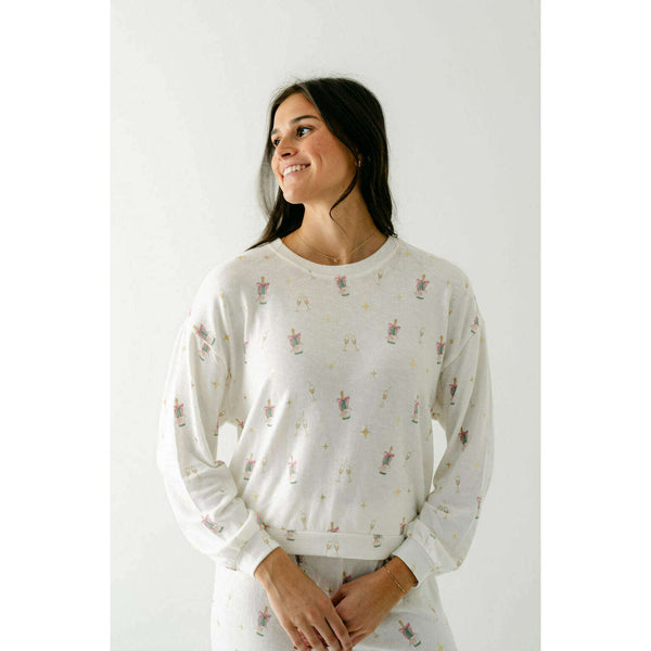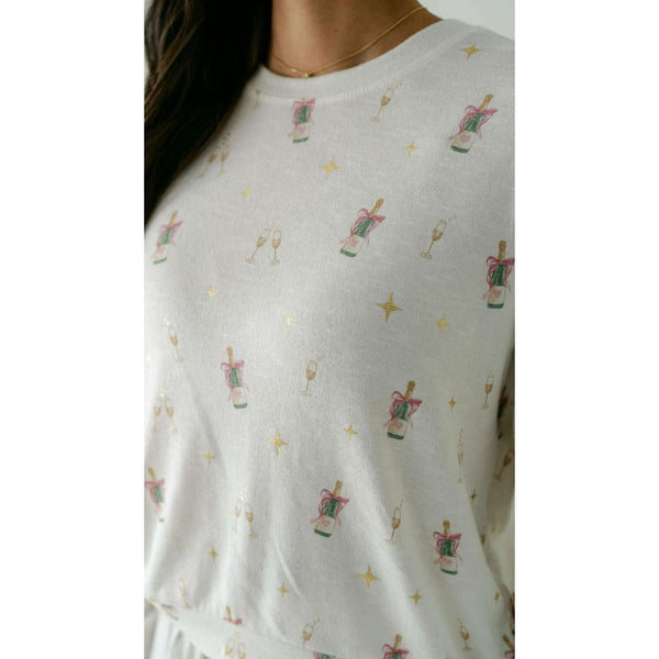 Printed with an allover champagne toast motif, this soft slub knit top blends fun and function. Relaxed and comfy, it’s made for sleep-ins, couch hangs, and slow holiday mornings. Relaxed fit Slub Sweater Knit: 52% Rayon 44% Polyester 4% Spandex...