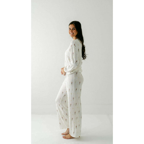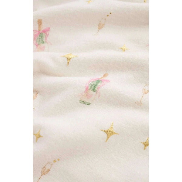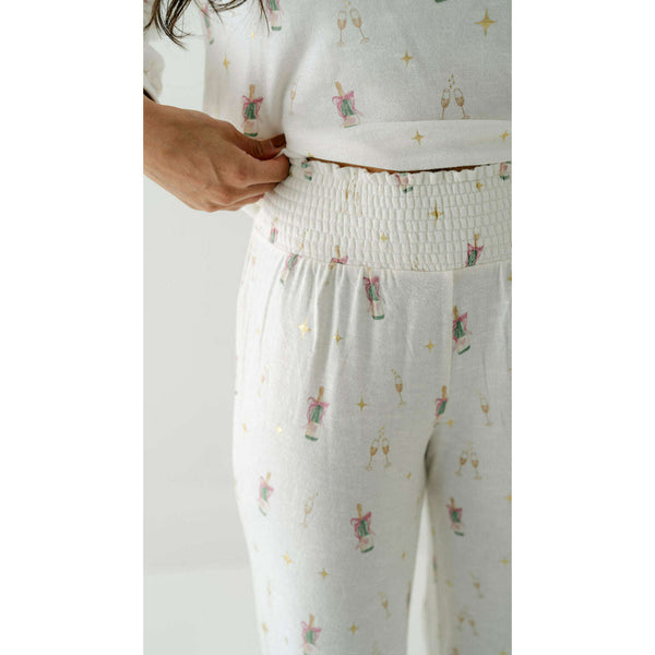 These wide-leg pants are printed with mini champagne bottles and finished with a comfy smocked waistband. The slub knit fabric brings softness with a hint of stretch for relaxing in style. Fit and flare Slub Sweater Knit: 52% Rayon 44%...