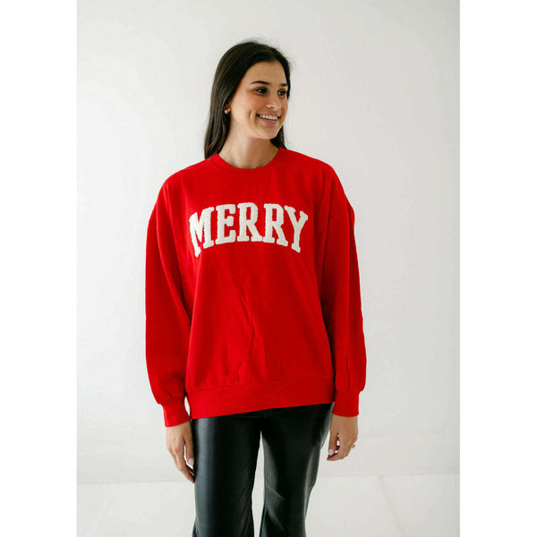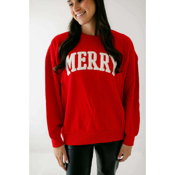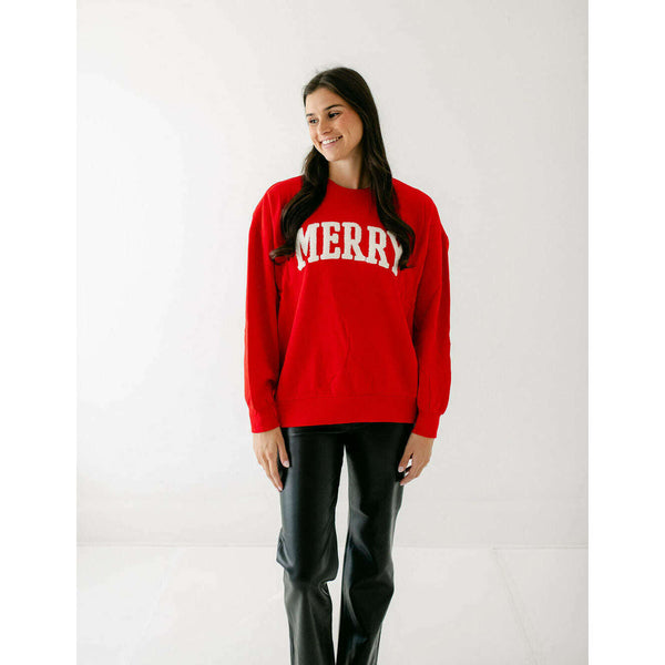 Made from mid-weight cotton fleece, this oversized sweatshirt delivers warmth and softness from the first wear. A statement “Merry” graphic in boucle appliqué gives it a festive finish, designed to stand out in her seasonal rotation. Fits generously, Sarah Grace...